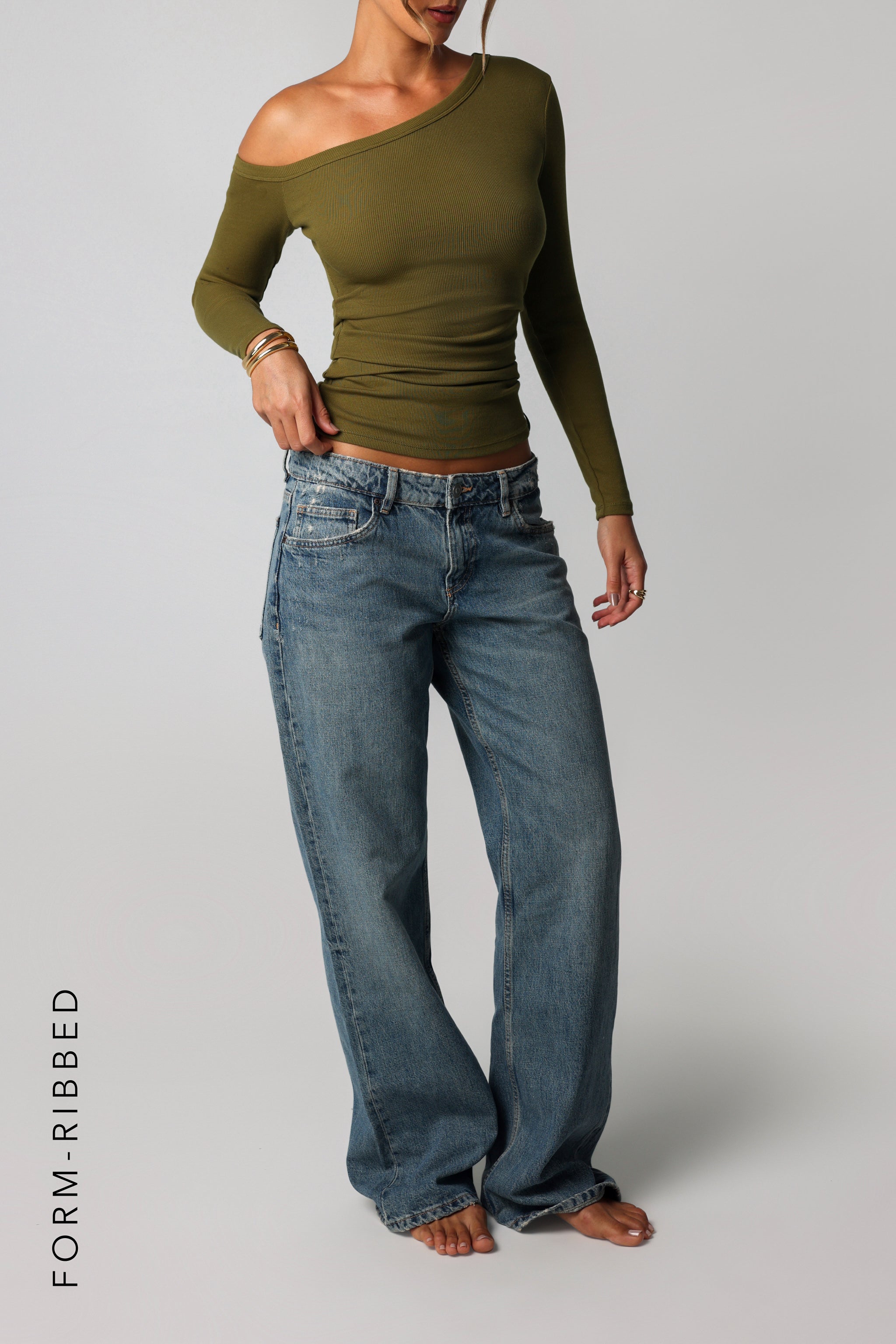 Highlights: single lined, vertical ribbed pattern, off shoulder, straight neckline
