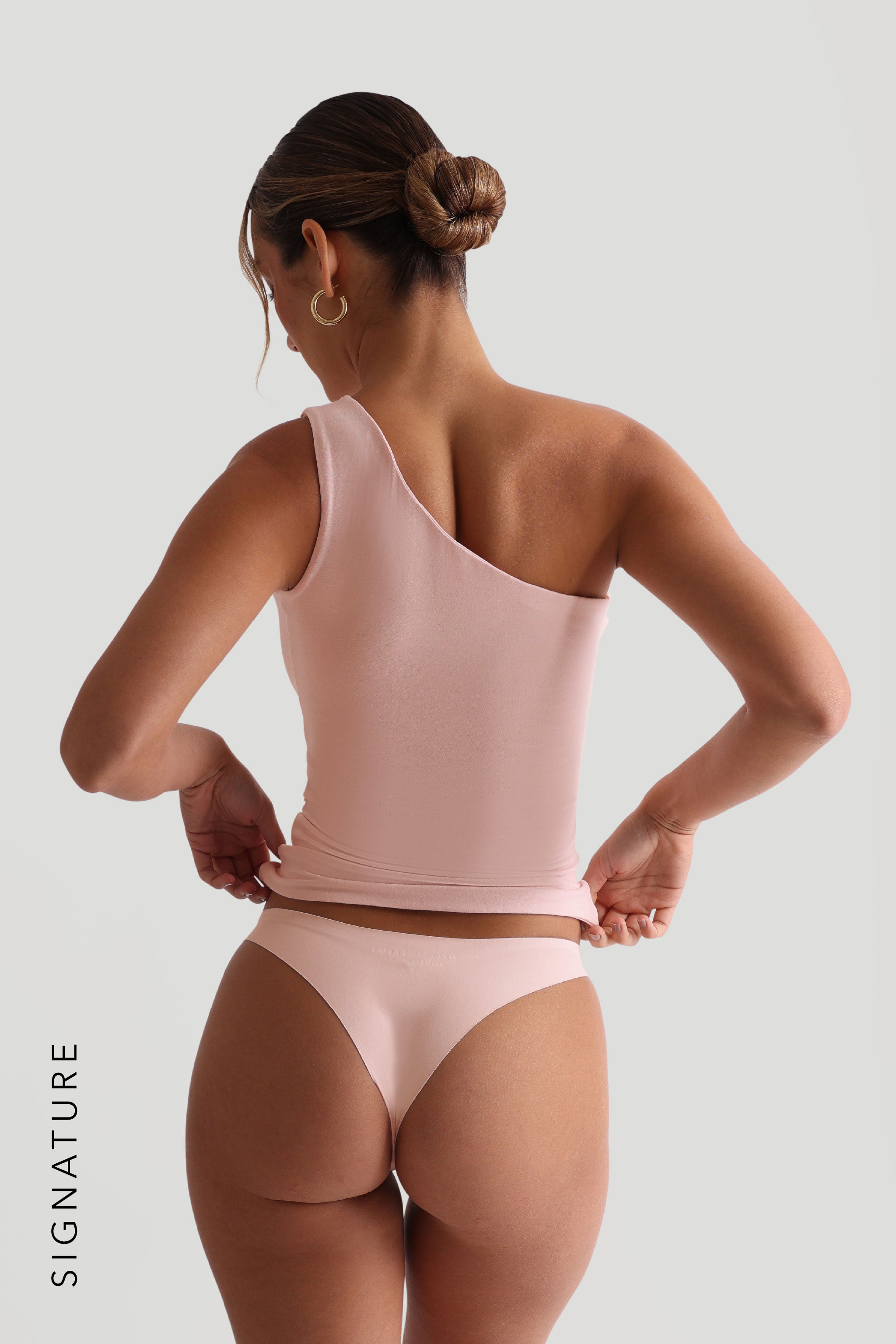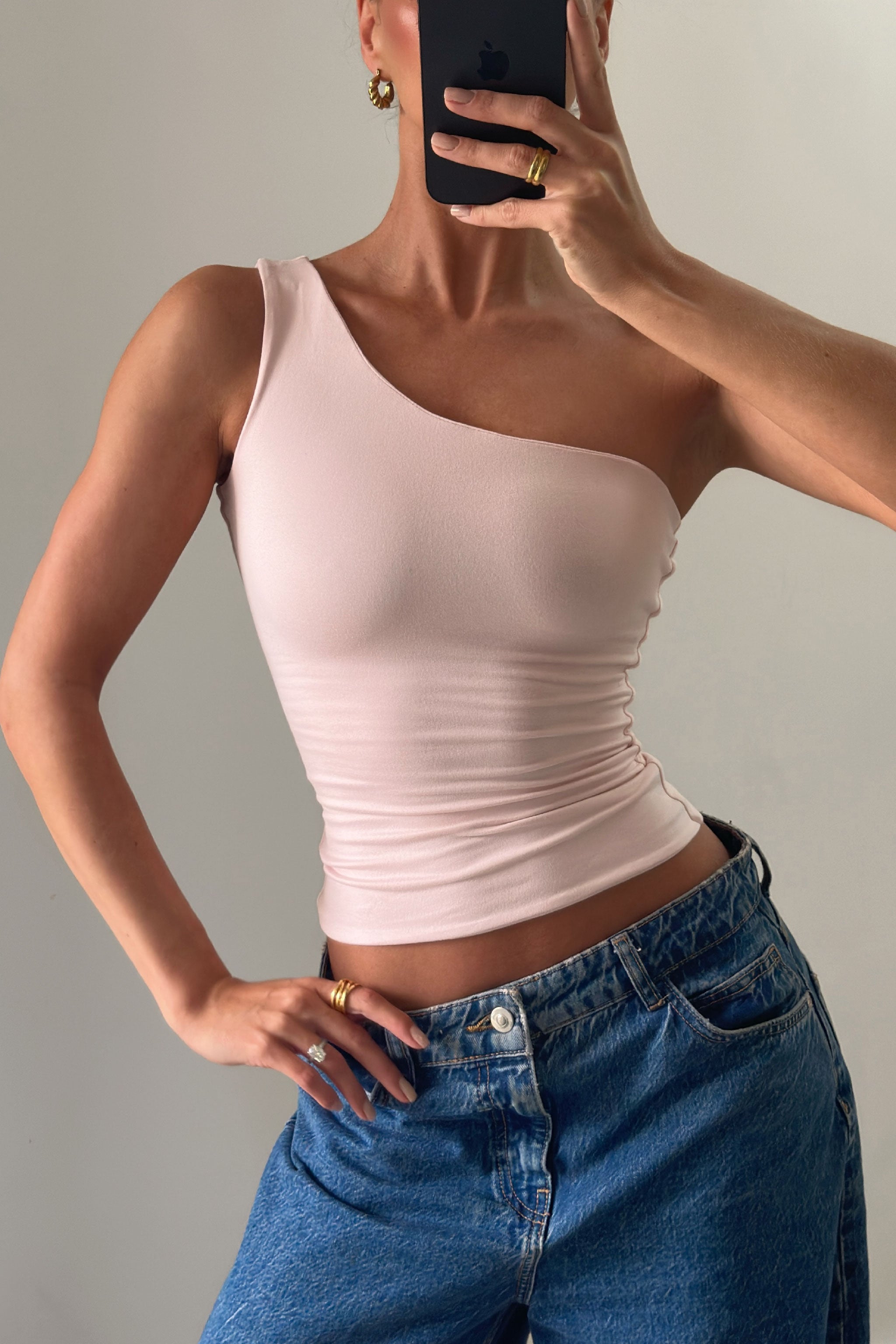 The One Shoulder T-Shirt features an exposed right shoulder for a touch of femininity, with a single strap and fabric that supports all chest sizes. This full-length top can be tucked in or left out, maintaining its seamless, flattering silhouette. Crafted from a fabric that gently cinches while feeling incredibly soft, it’s the perfect balance of comfort and elegance for everyday wear.