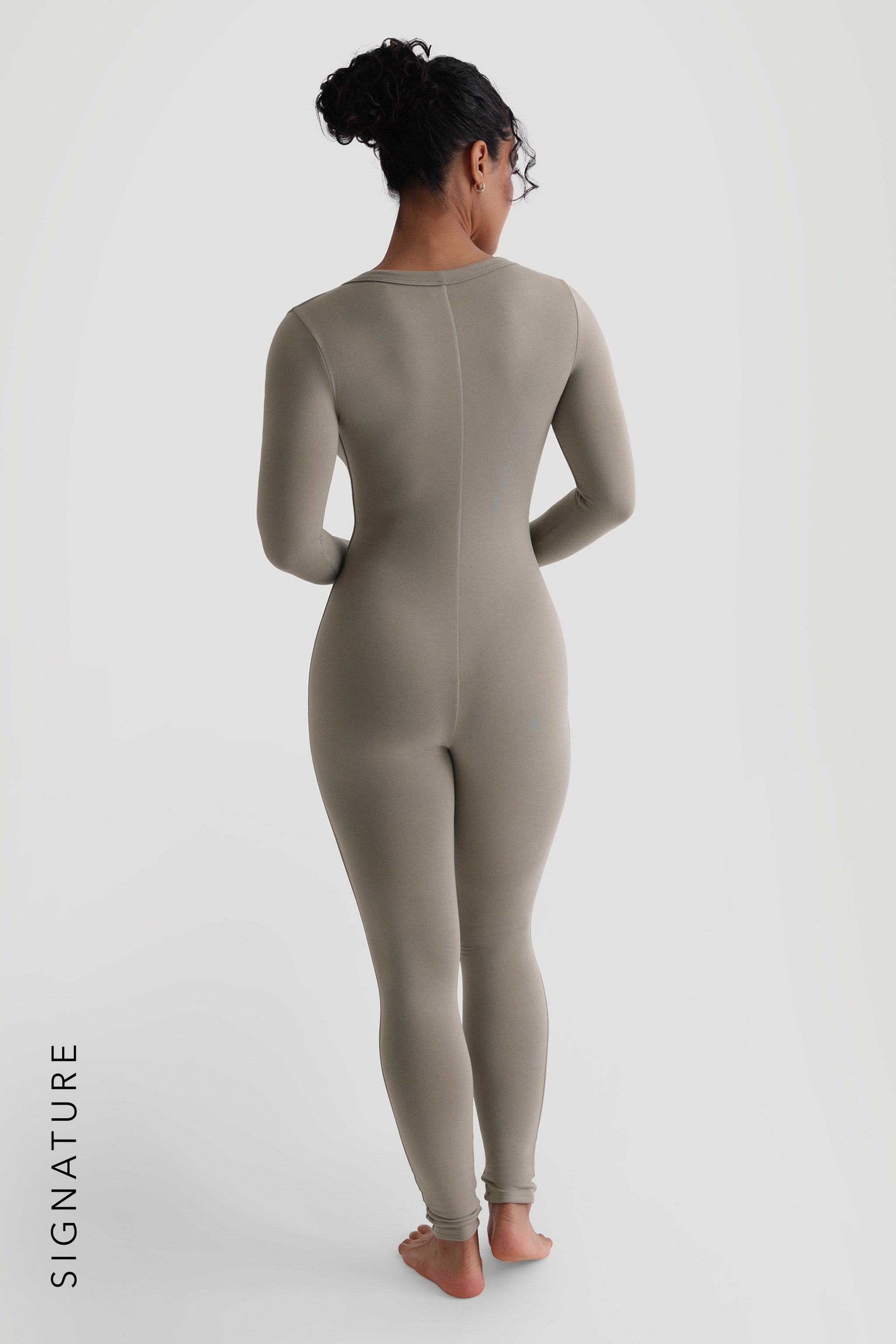 The U-Shape Long Sleeve Jumpsuit features a one-inch banding along the scooped neckline to flatter any chest size.