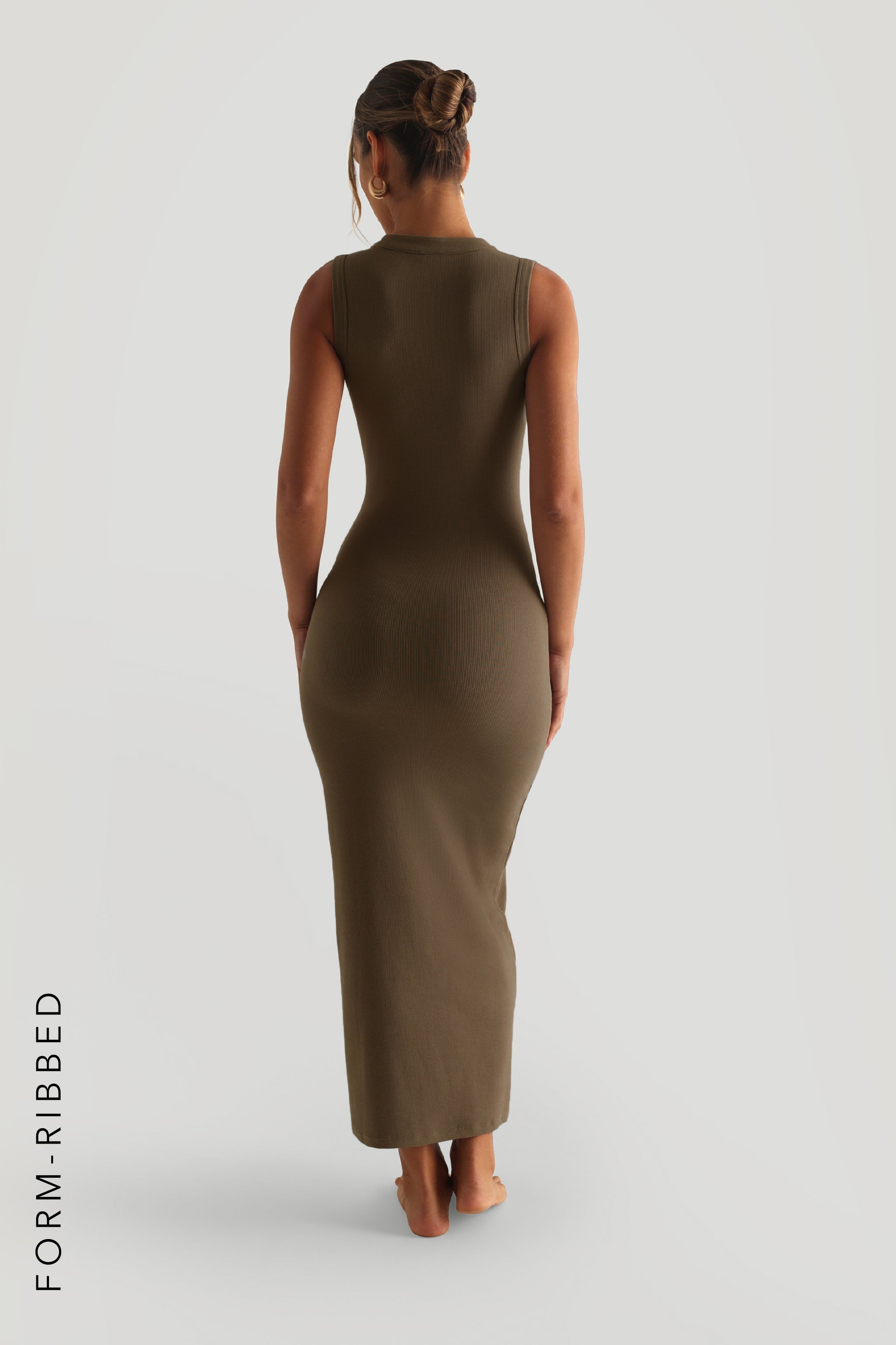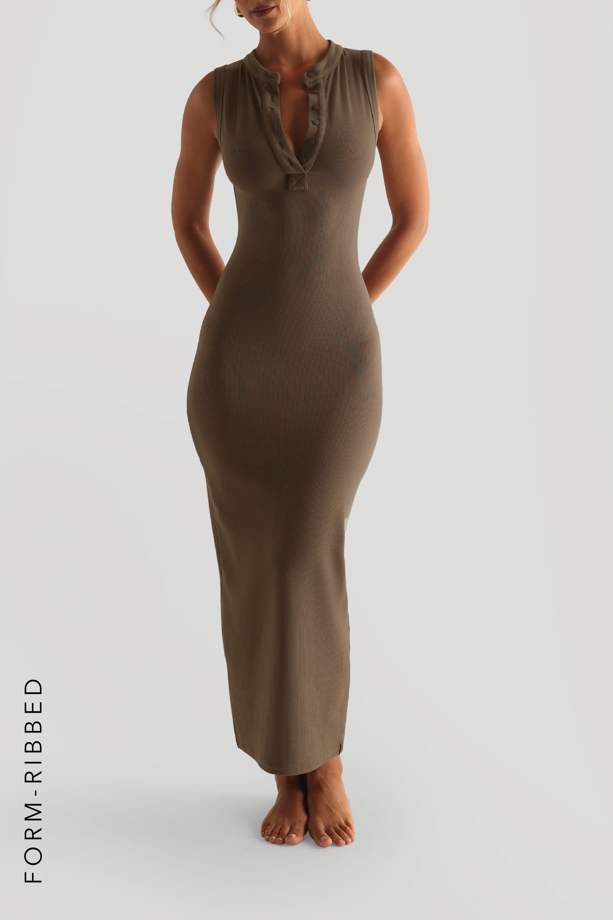 Form-Ribbed Button-Down Maxi Dress - Latte Taupe