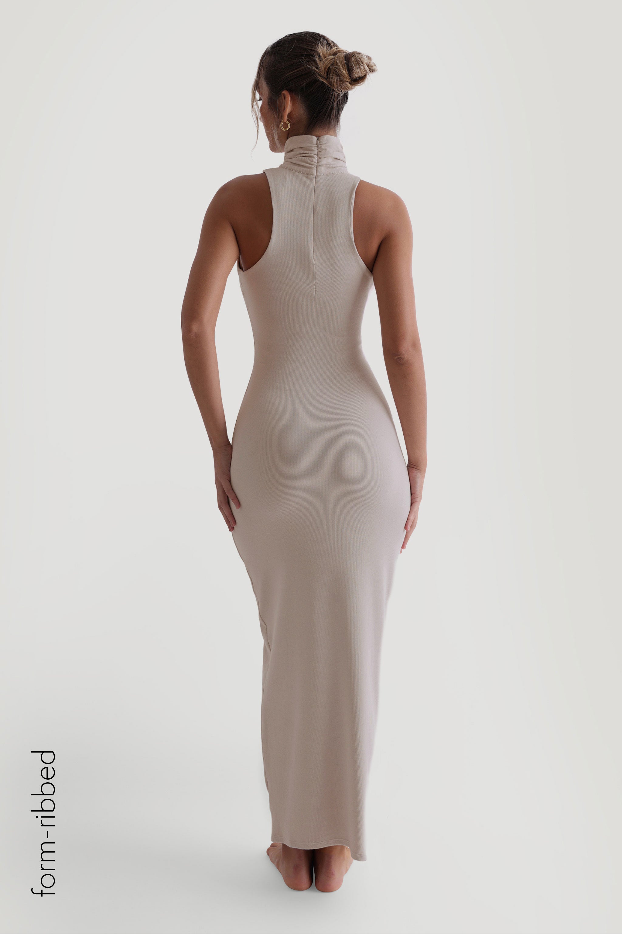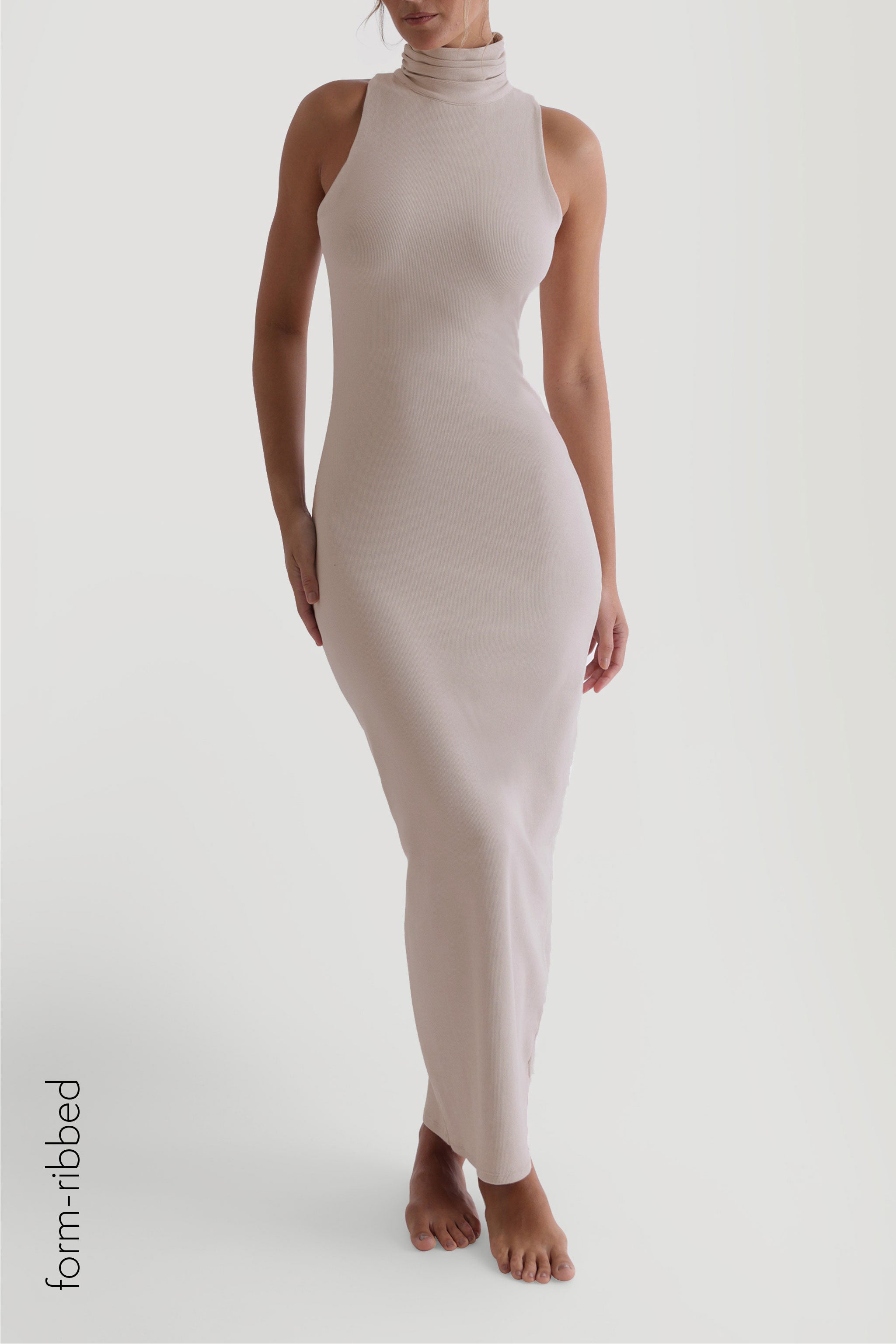 Sleeveless Turtleneck Form-Ribbed Maxi Dress - Light Oat