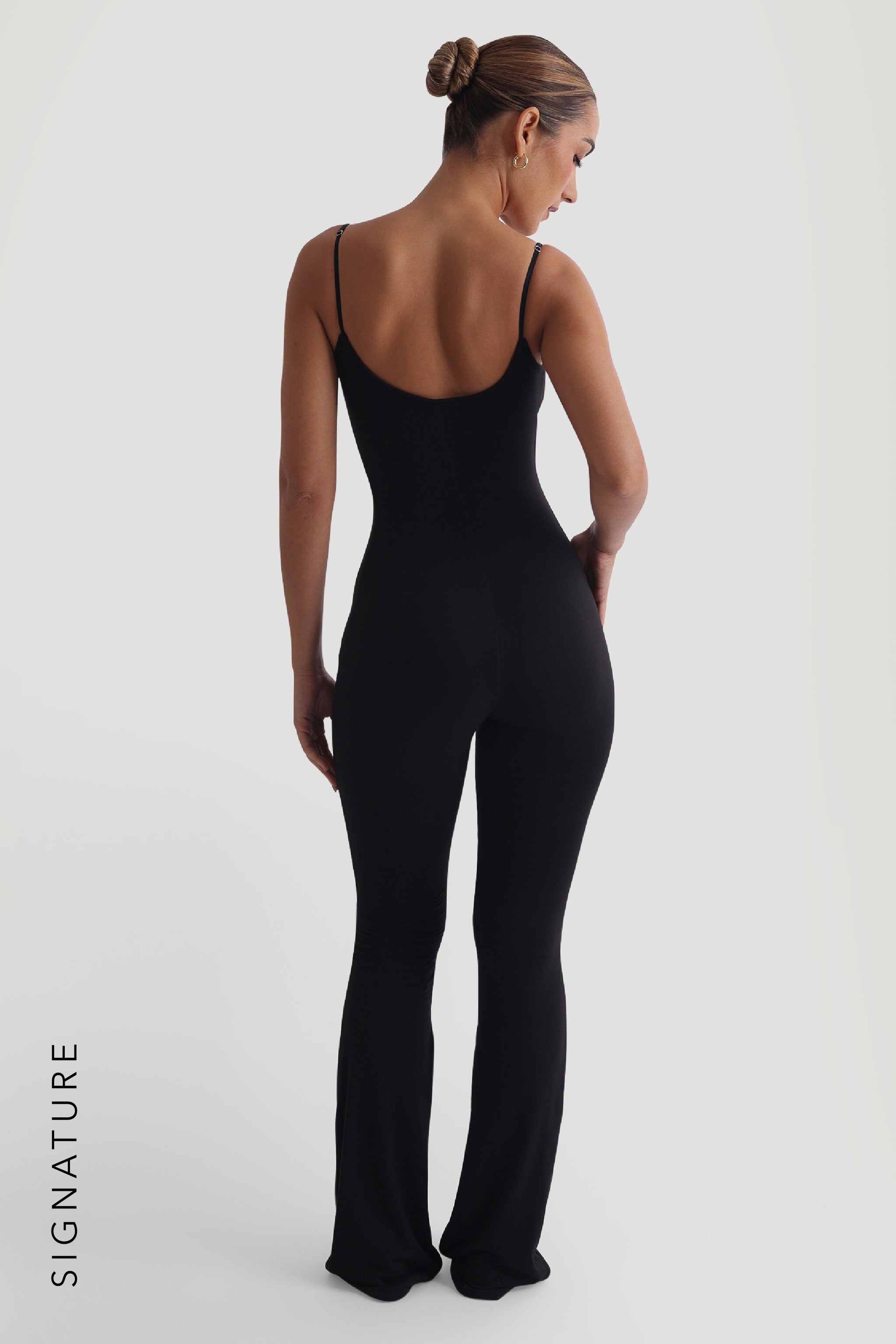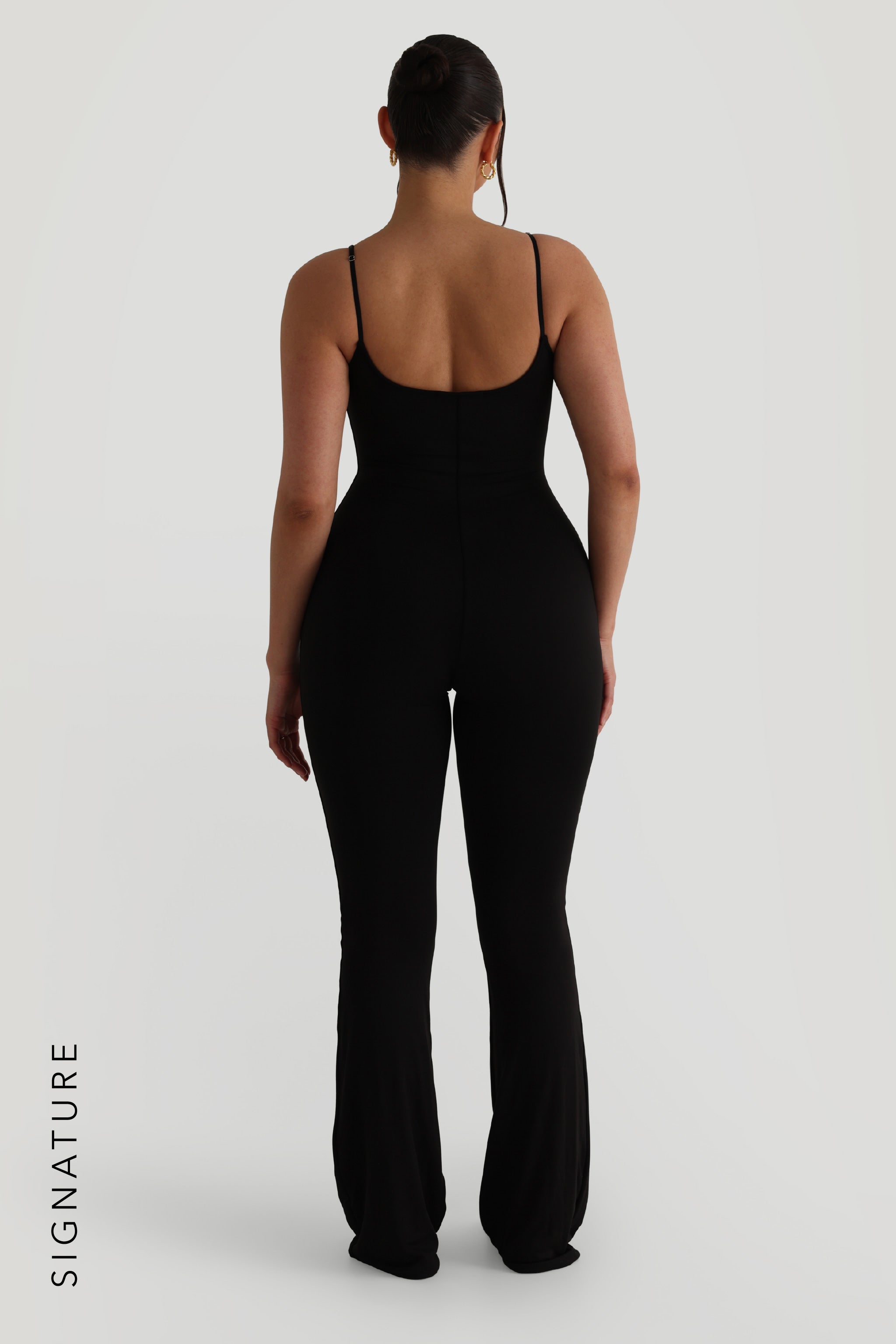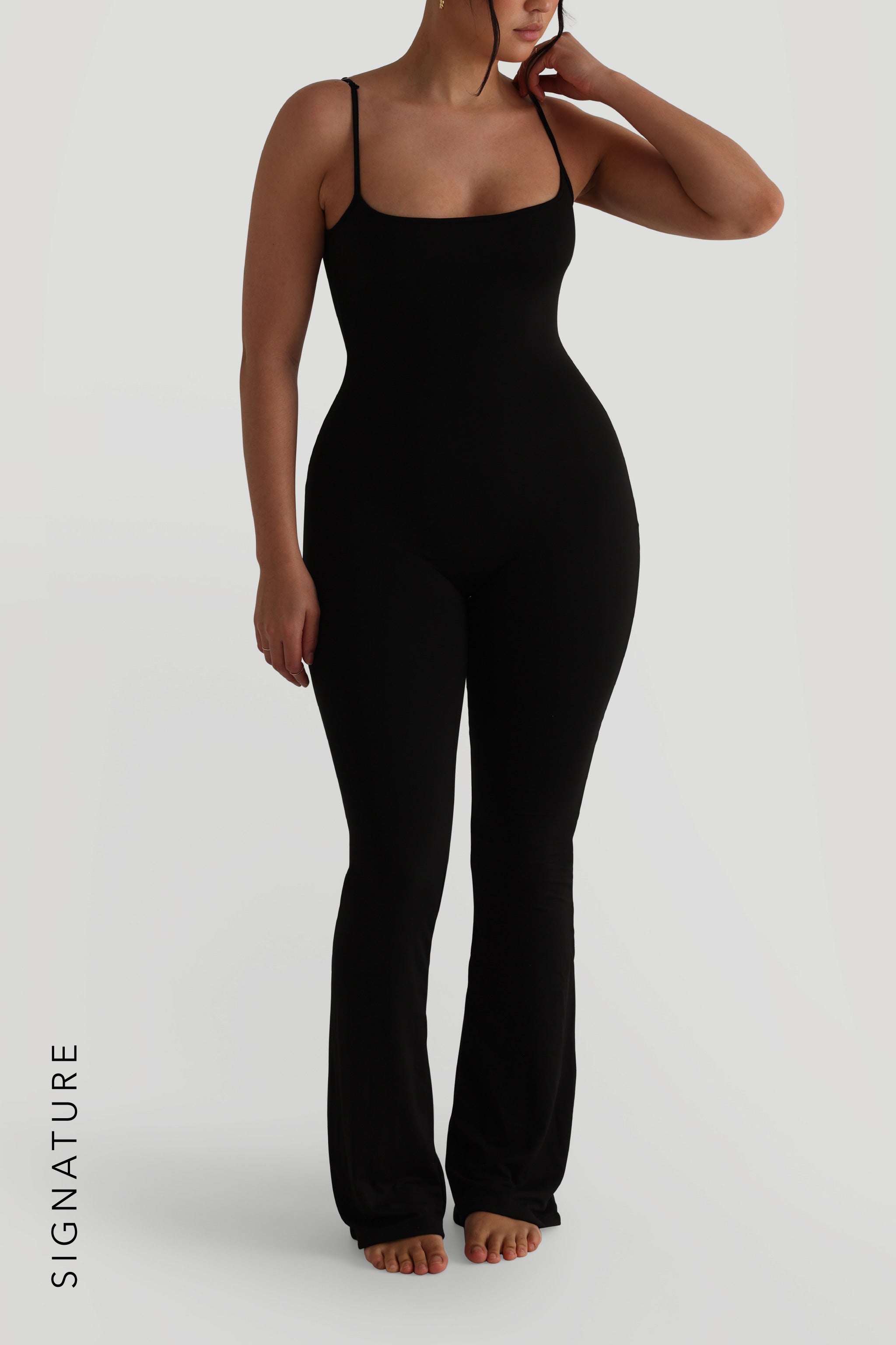 The Prime Cami Flared Jumpsuit provides a seamless experience when slipped on. It features adjustable straps, a flared bottom and a scooped neckline to flatter all chest sizes.