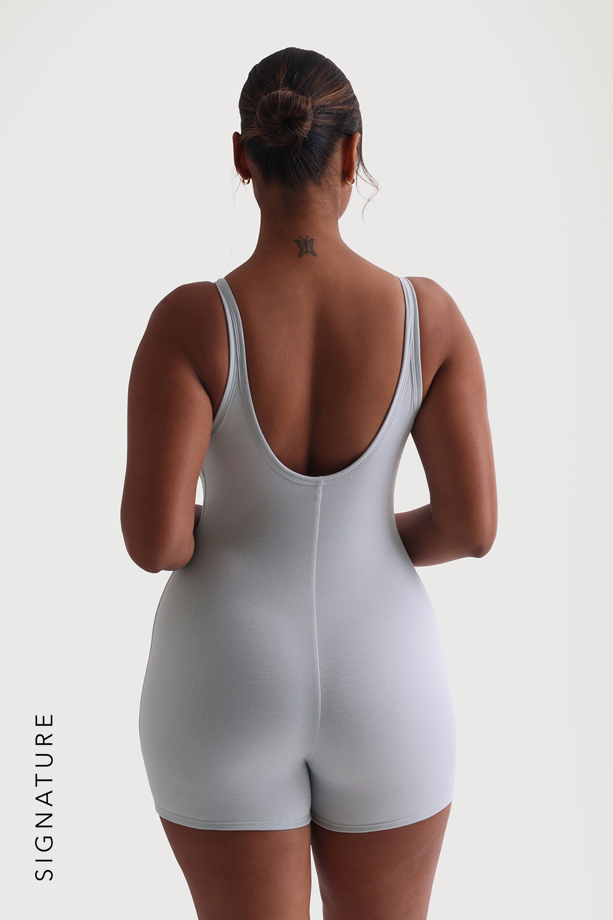 The Banded Scoop Neck Romper was designed with a scooped open back that compliments its scooped neckline. It features a thin trim along the neckline for added detail and contrast.