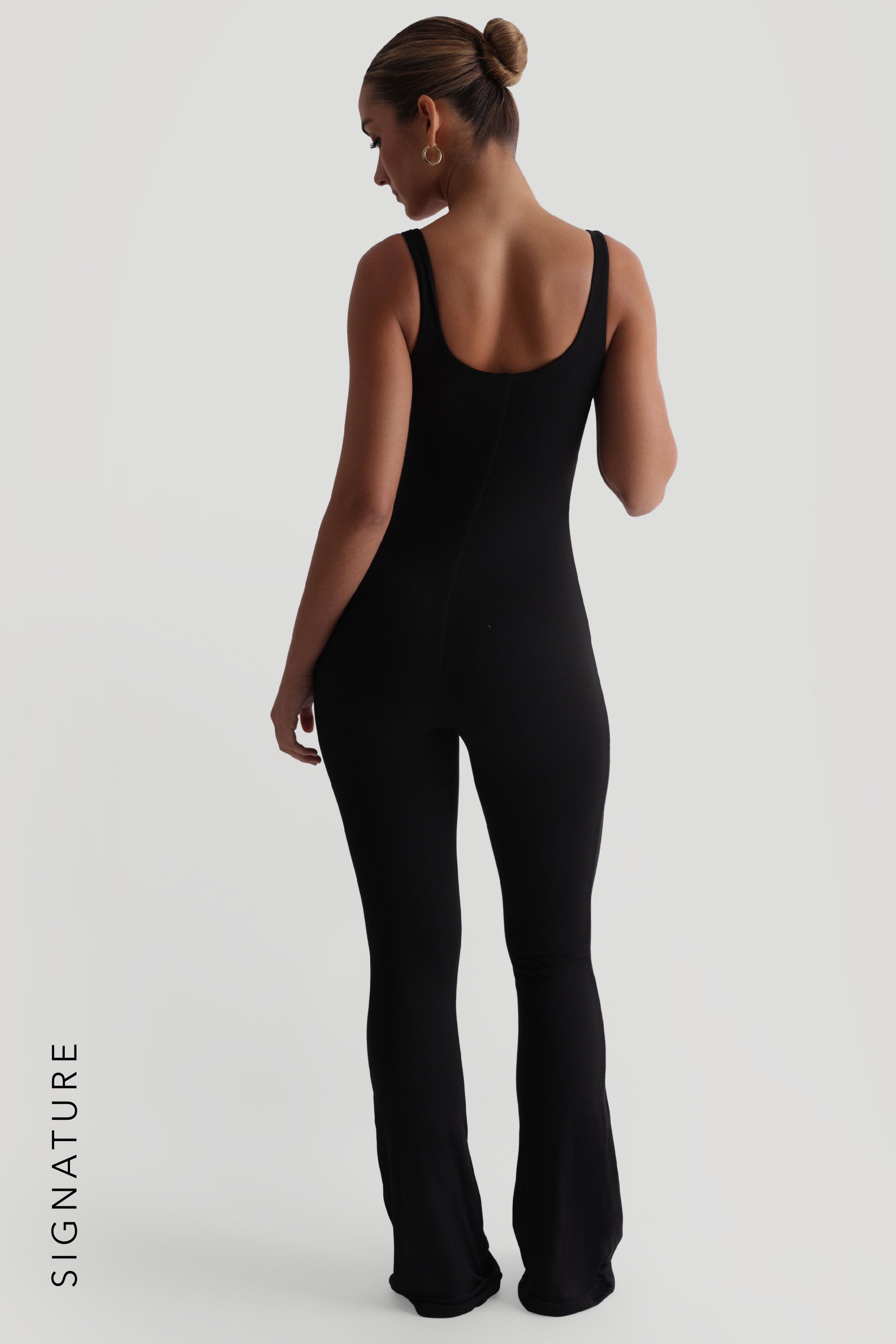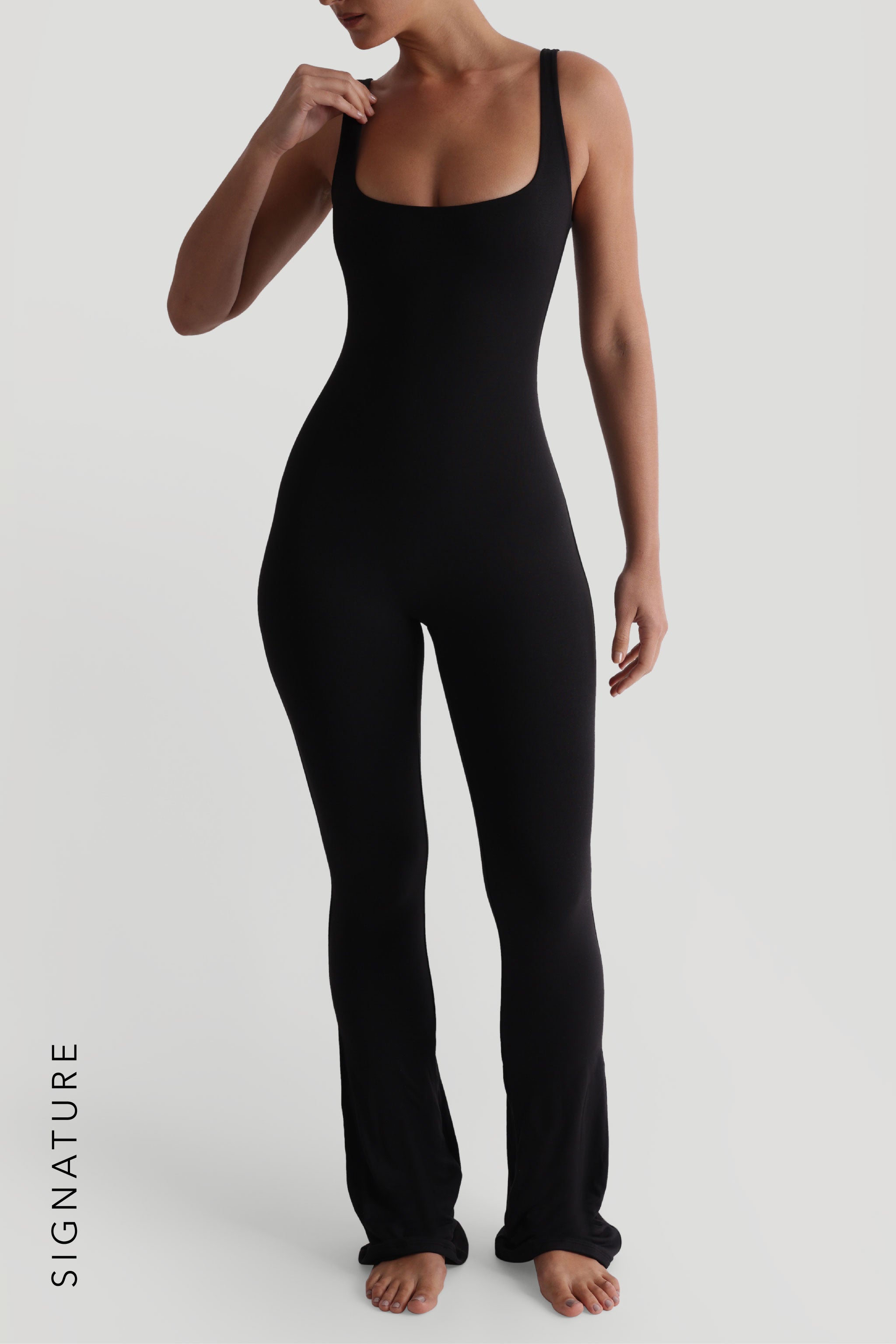The Second Skin Flared Jumpsuit was inspired by our tank top with the same square neckline and square back. It comes in two lengths to fit all heights and has a flared bottom.