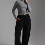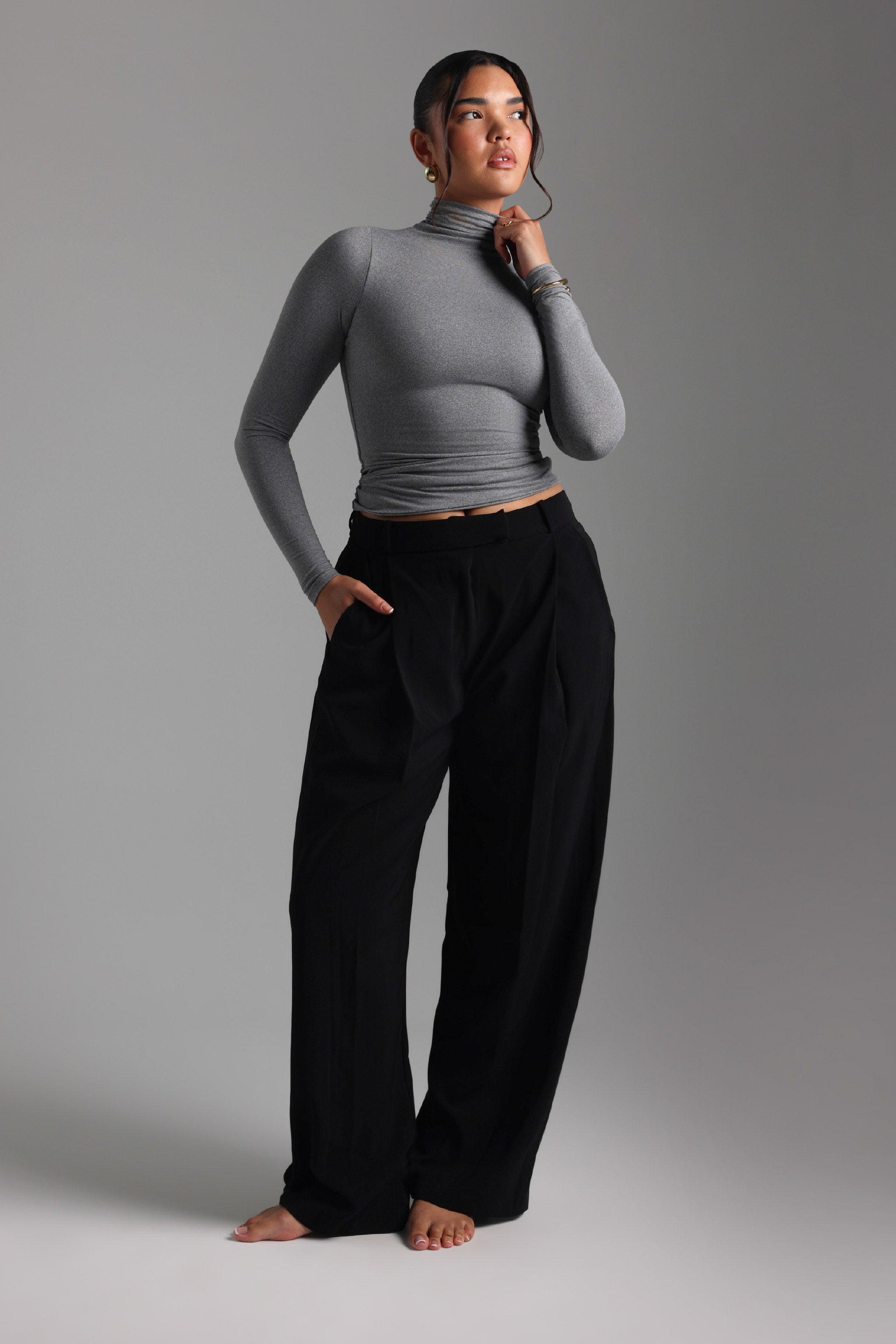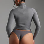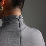 The Refined Long Sleeve Turtleneck T-Shirt features a thoughtfully engineered invisible, back zipper, designed to facilitate effortless dressing while preserving your hairstyle and makeup.