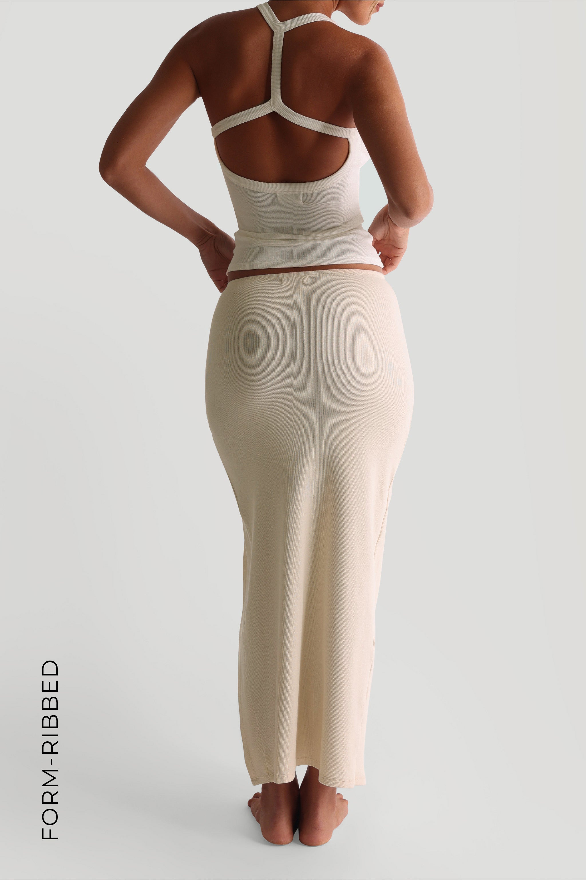 The Form-Ribbed Maxi Skirt pairs soft structure with minimalist design. Crafted to contour gently, this piece flows into a captivating side slit, providing confidence with every step.