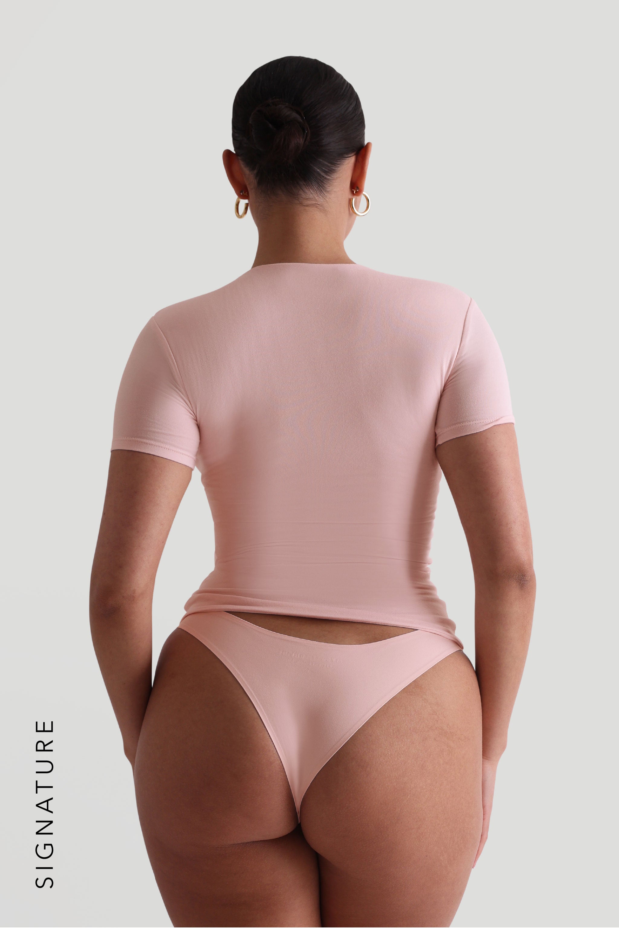 Kurzärmliges T-Shirt in voller Länge, doppellagiges Oberteil mit hohem Ausschnitt. Dieses Teil fühlt sich beim Reinschlüpfen wie maßgeschneidert an und ist somit das perfekte Grundelement in Ihrer Garderobe.