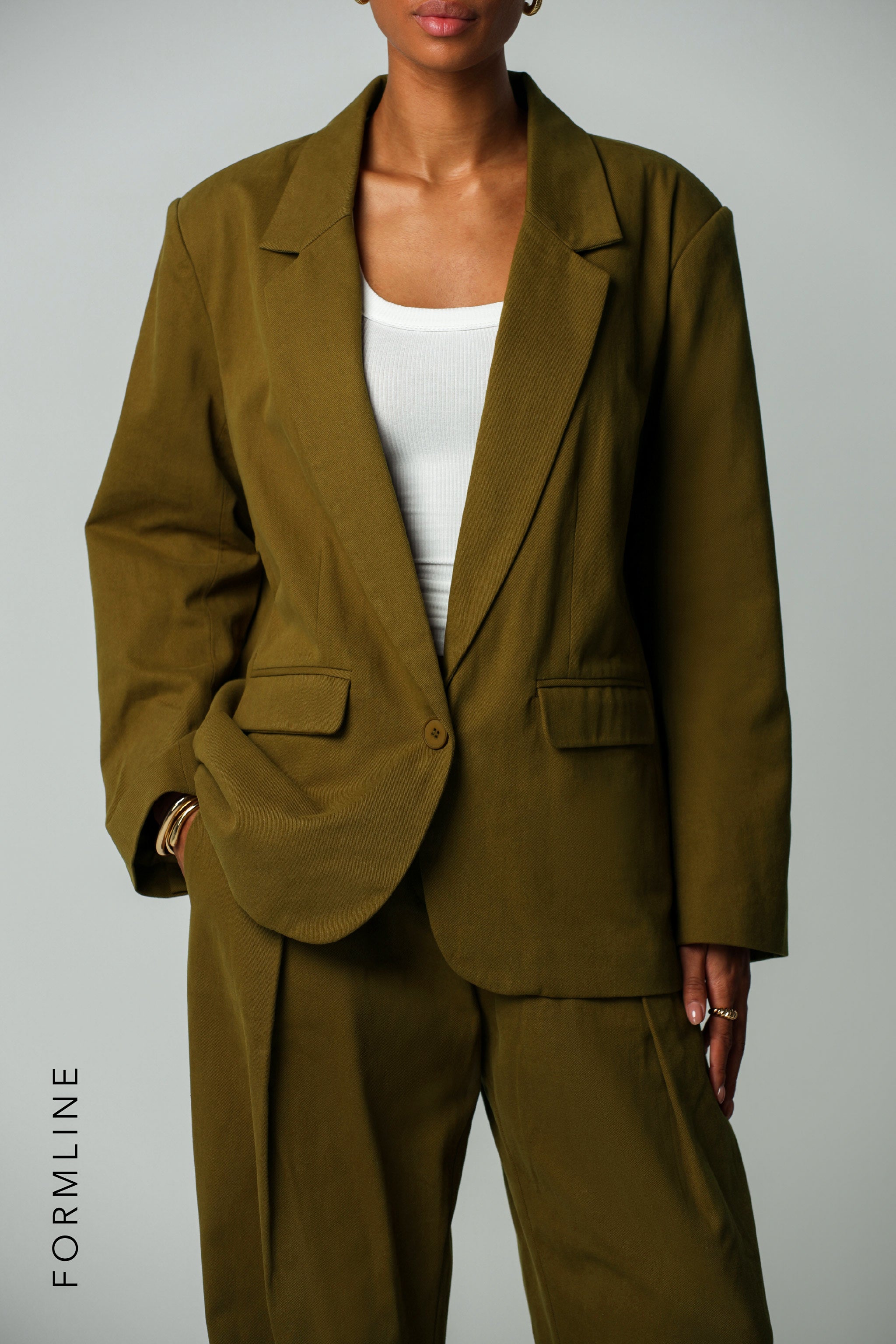 Highlights: single breasted jacket, jetted pocket with flap, notched lapel, shoulder pads, fully lined
