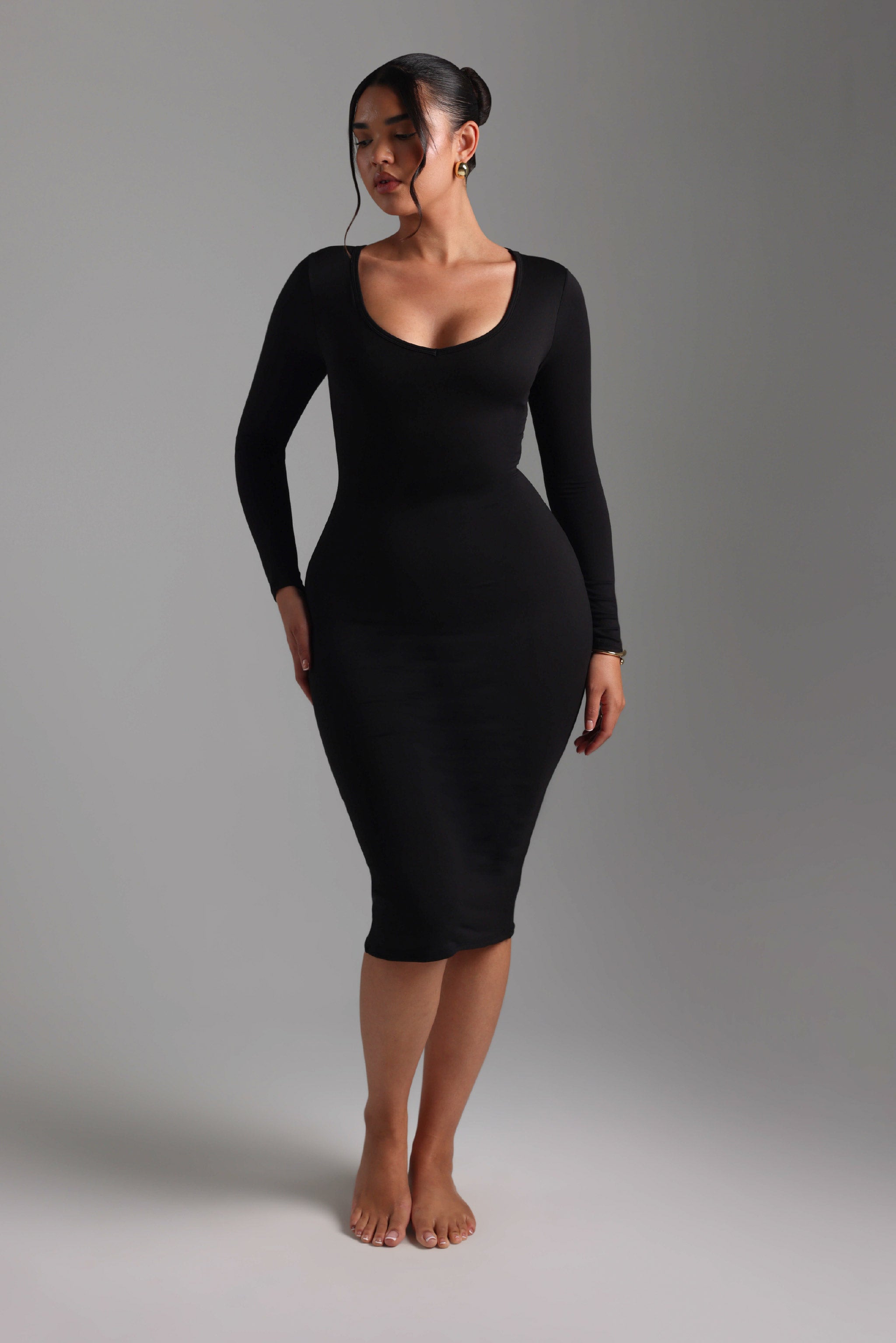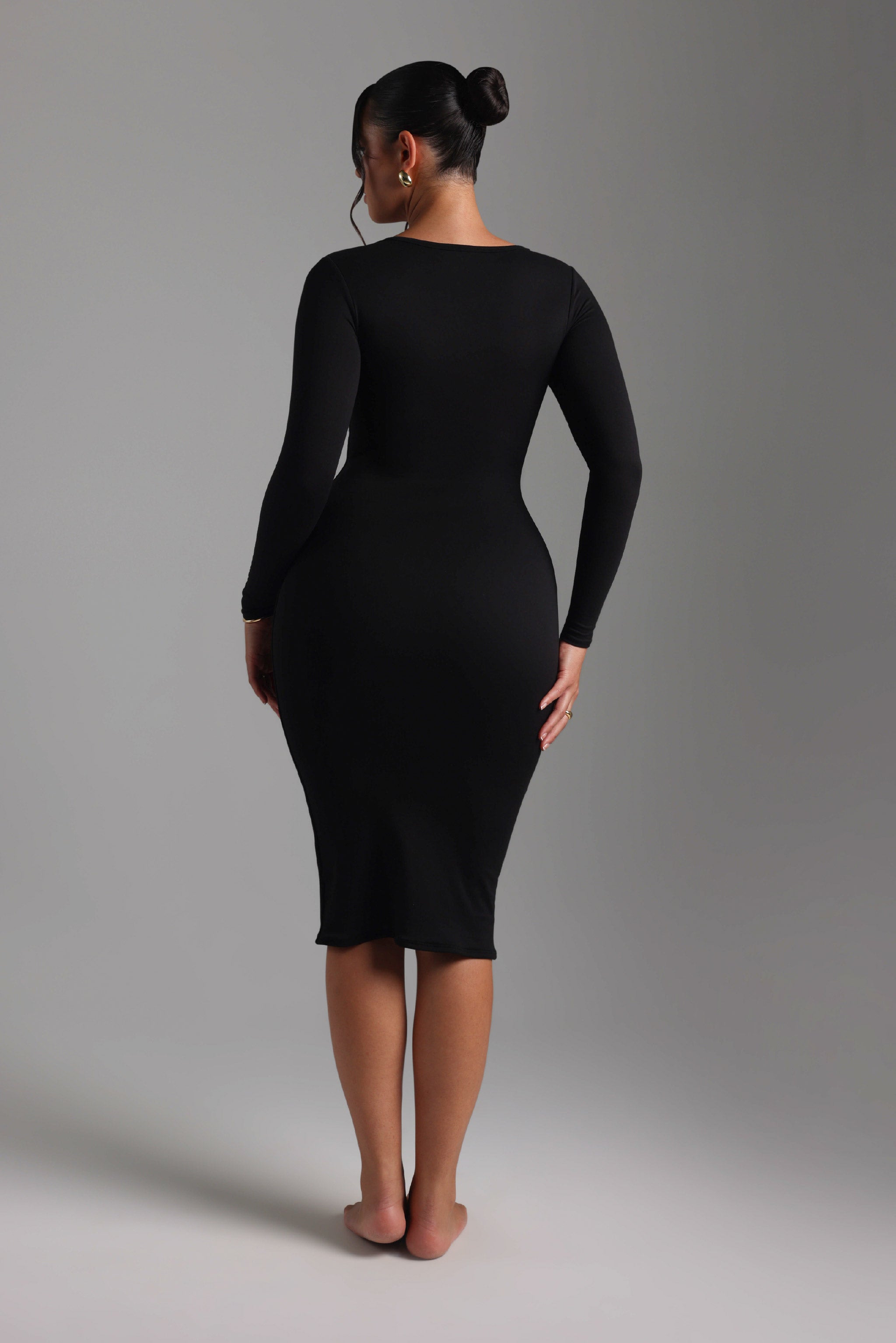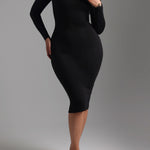 V-Shape Long Sleeve Midi Dress - Black