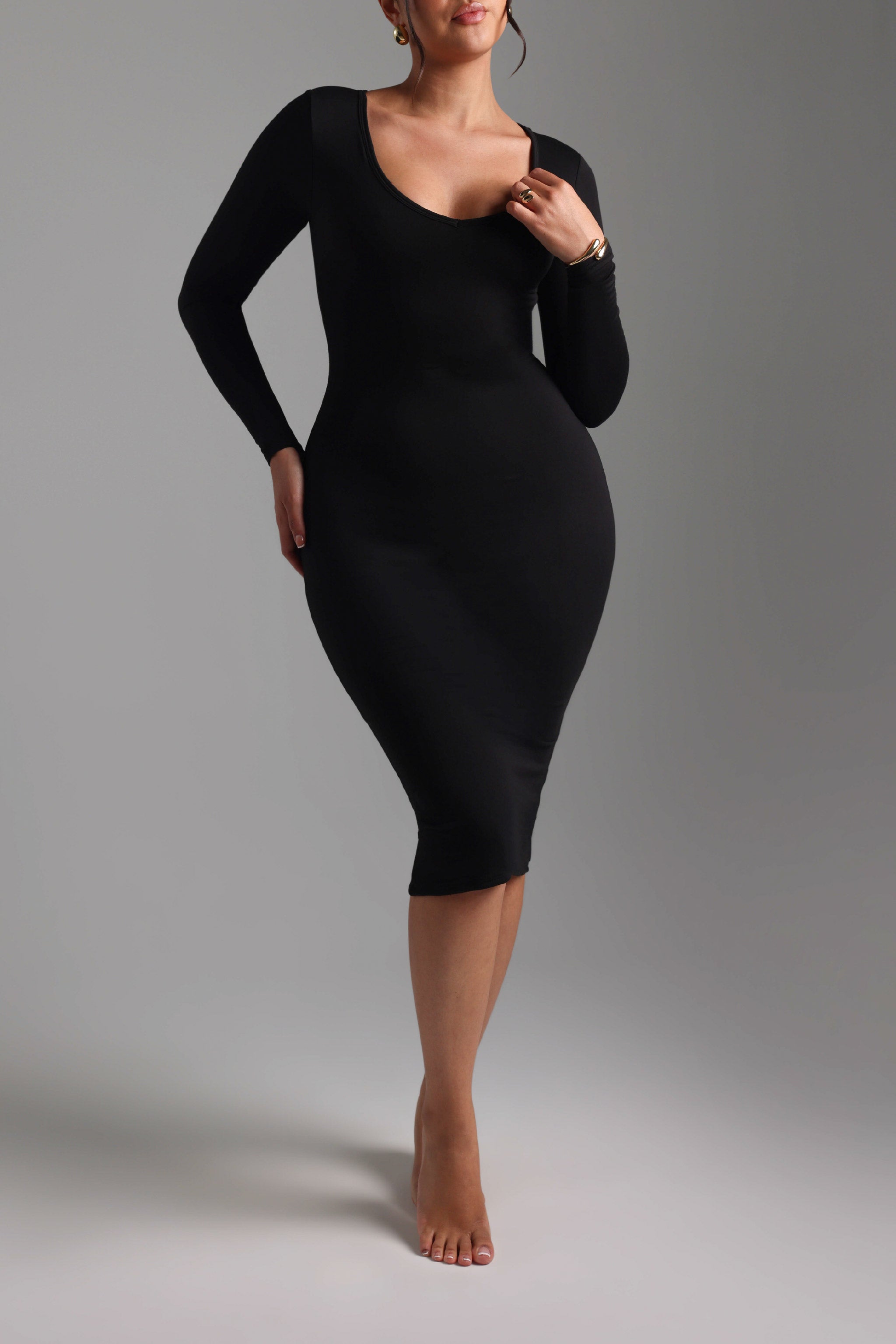Made in our Signature Fabric, the V-Shape Long Sleeve Midi Dress features a thin banding along the v-shaped neckline to flatter and support all chest sizes.