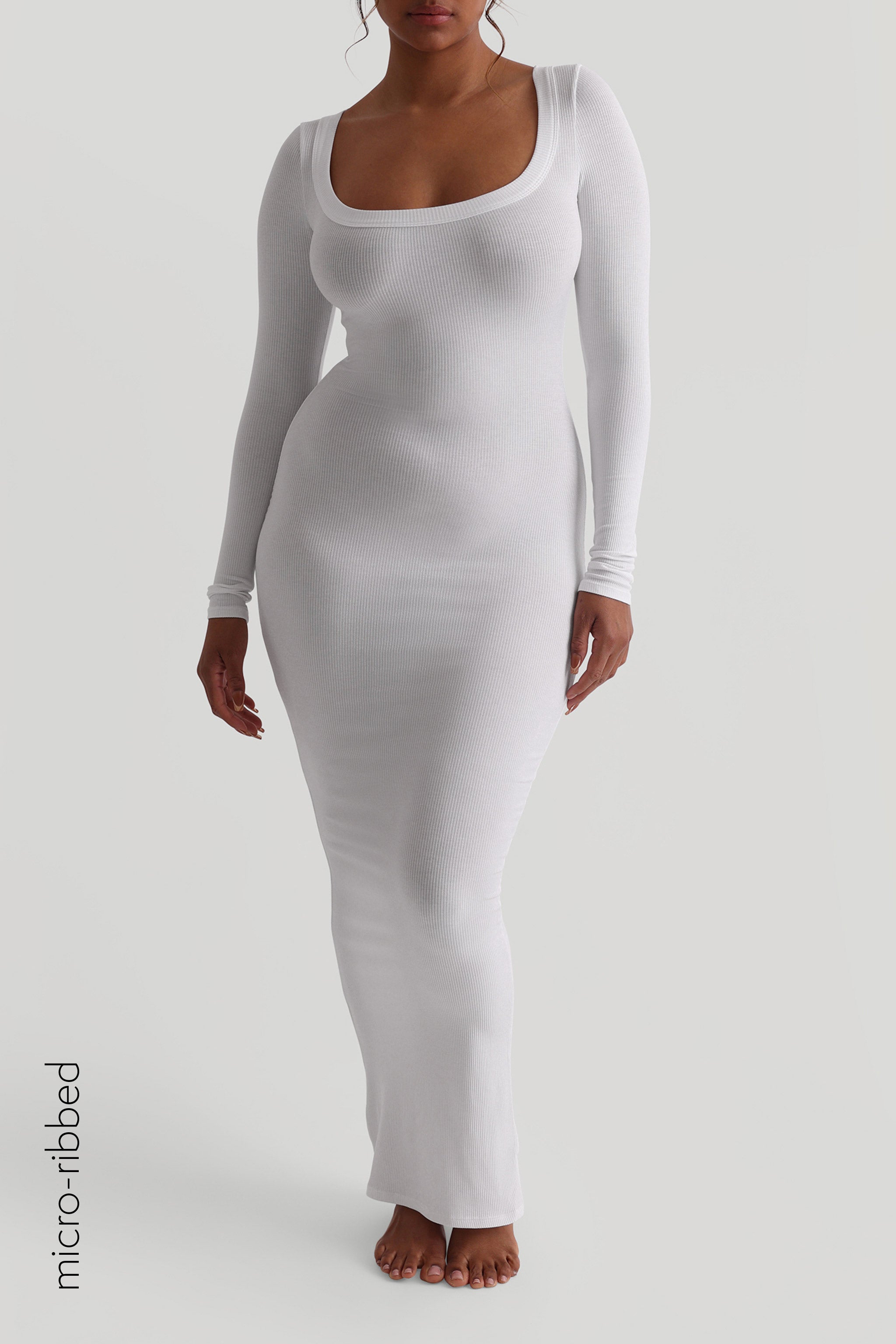 Maxikleid mit U-Ausschnitt und Mikrorippenmuster - Weiß
