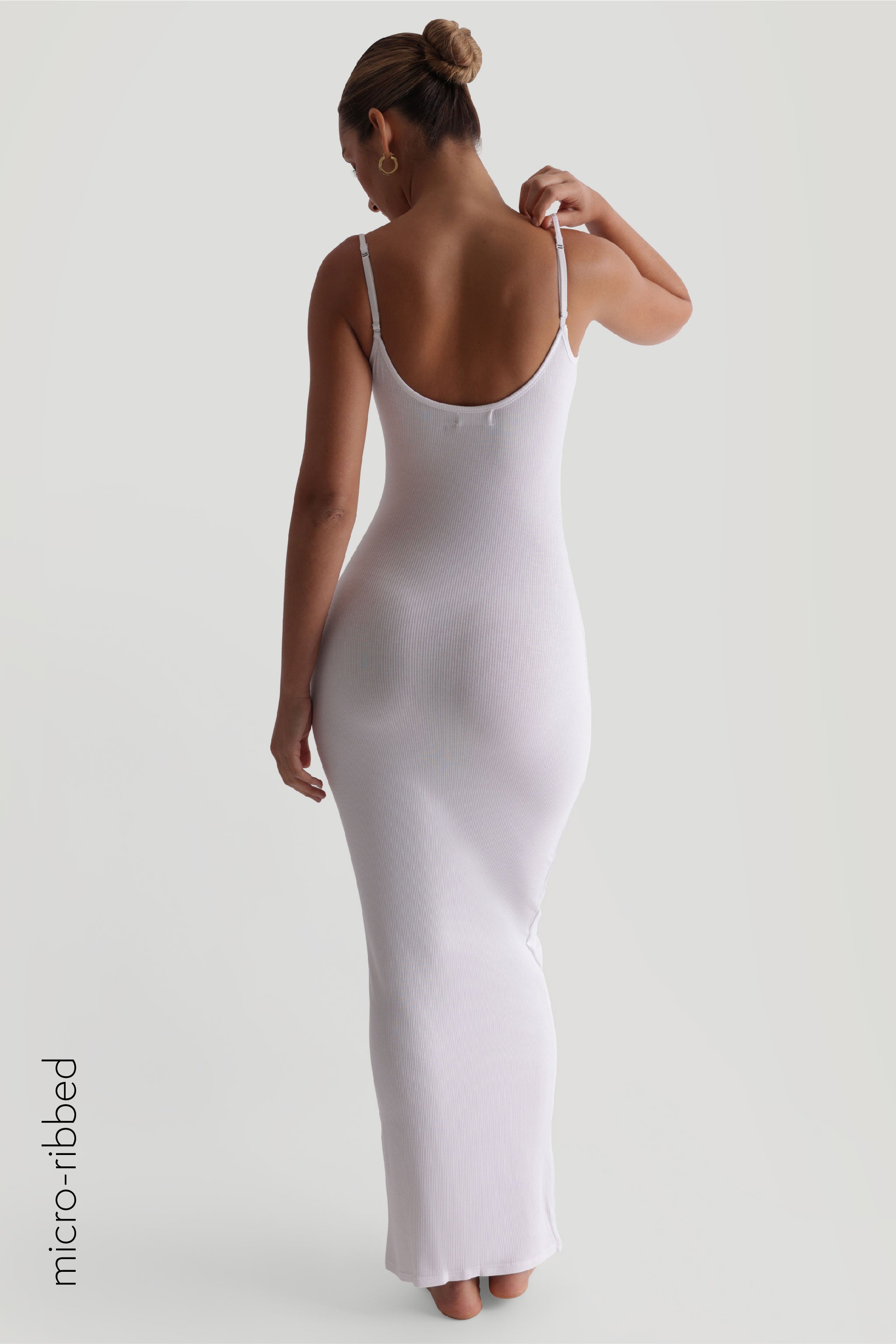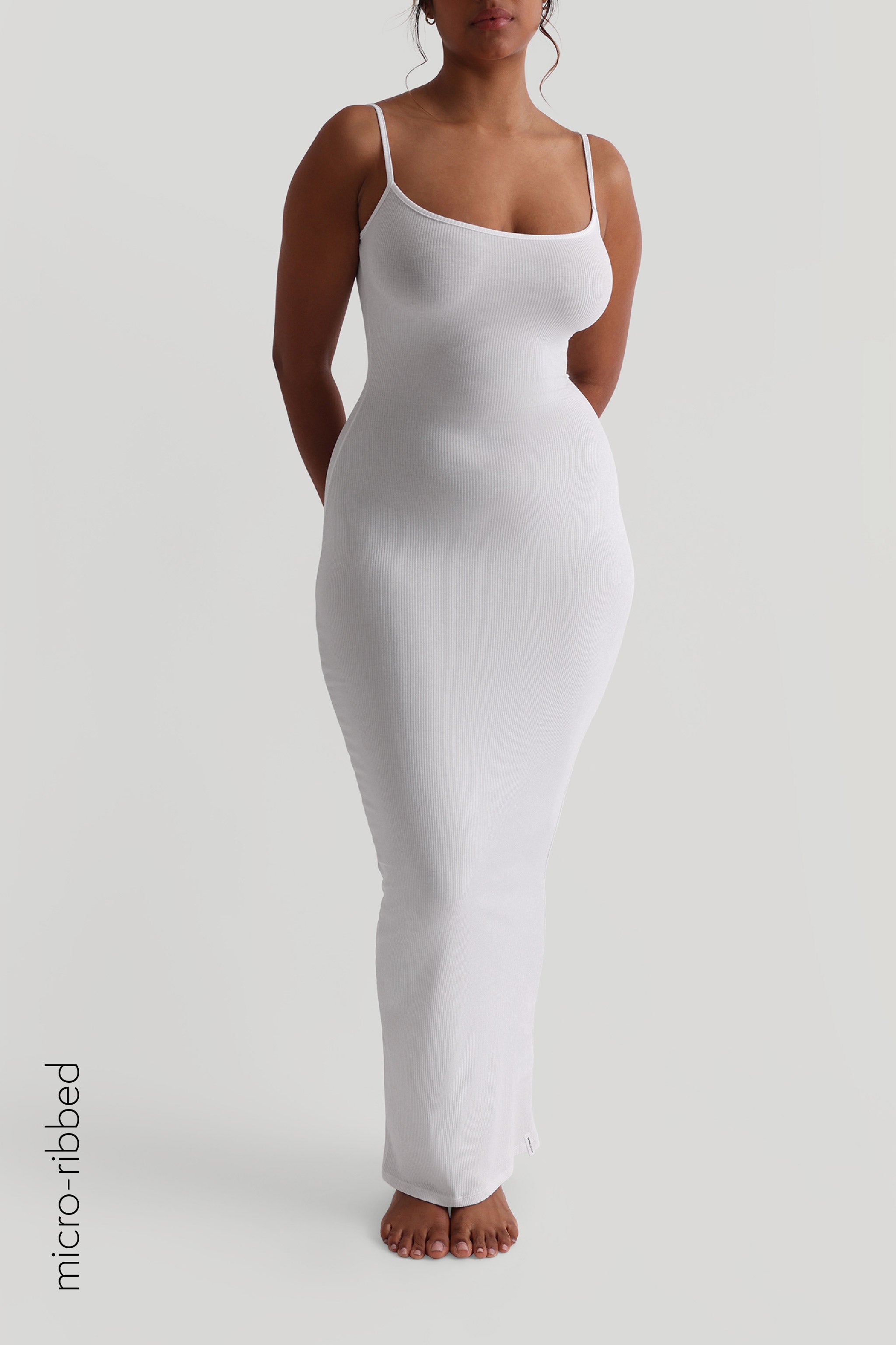 Das Slip-On Micro-Rippen-Maxikleid aus unserem Micro-Rippen-Stoff bietet eine leichtes, nahtloses Tragegefühl beim Reinschlüpfen. Es verfügt über verstellbare Träger und einen Rundhalsausschnitt, der allen Brustgrößen schmeichelt.