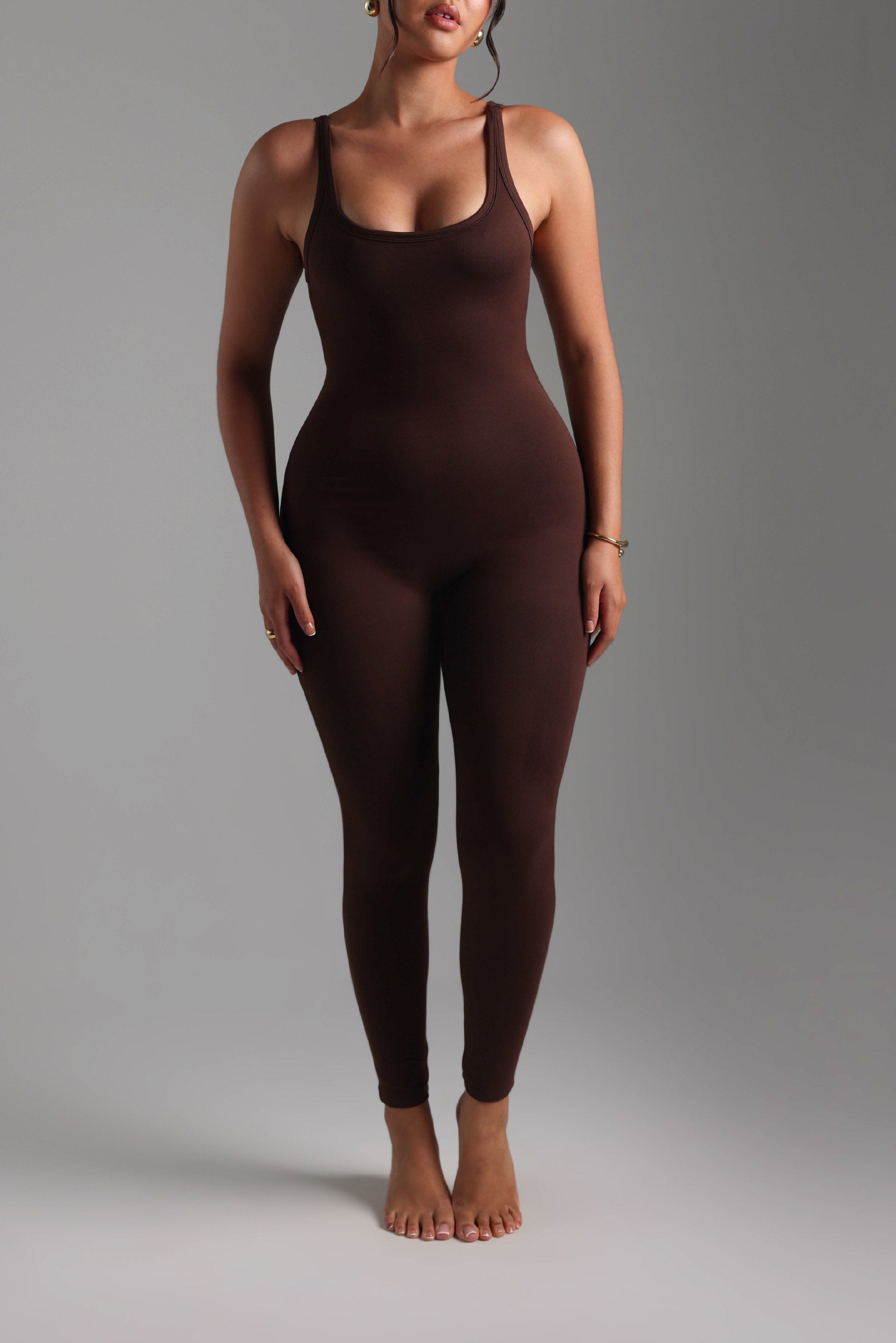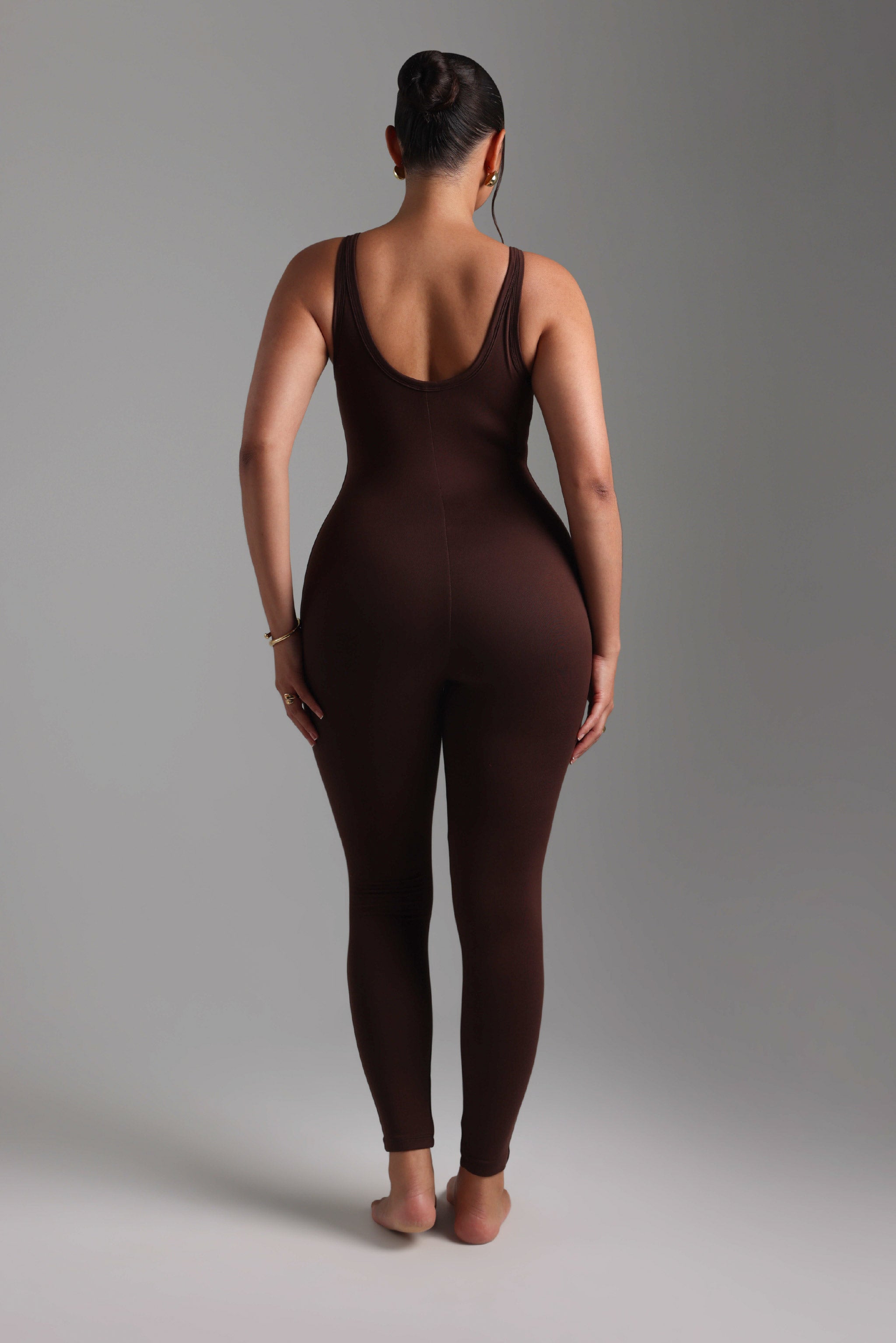 The Banded Scoop Neck Jumpsuit was designed with a scooped open back that compliments its scooped neckline. It features a thin trim along the neckline for added detail and contrast.