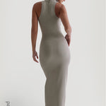 The Sleeveless Turtleneck Form-Ribbed Maxi Dress features a thoughtfully engineered invisible, back zipper, designed to facilitate effortless dressing while preserving your hairstyle and makeup. It includes an inner chest lining for added support and coverage.
