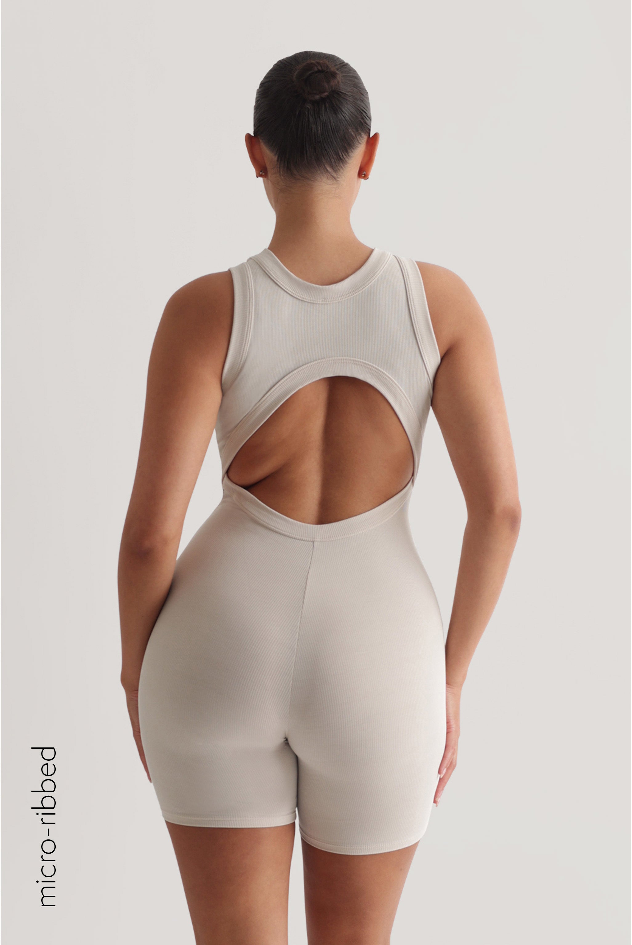 Strampler mit Mikrorippenmuster Oberschenkellanger, hochgeschlossener Strampler mit offenem Rücken. Dieser leichte Strampler wurde mit Blick auf Stil und Funktionalität entworfen und ist perfekt für wärmere Tage.
