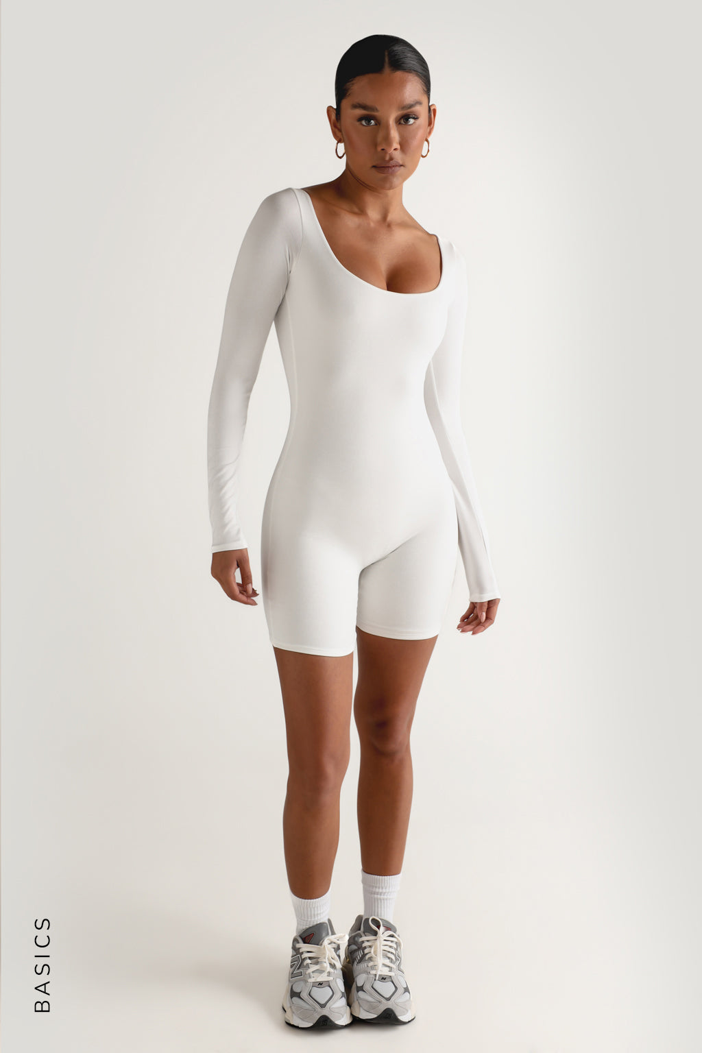 Oberschenkellanger Strampler mit Rundhalsausschnitt und langen Ärmeln und abgerundetem Ausschnitt. Dieser Strampler besticht durch Schlichtheit mit unserem doppellagigen, charakteristischen Stoff, der Ihre Silhouette formt und betont, was ihn zu einem vielseitigen und dennoch unverzichtbaren Kleidungsstück macht.