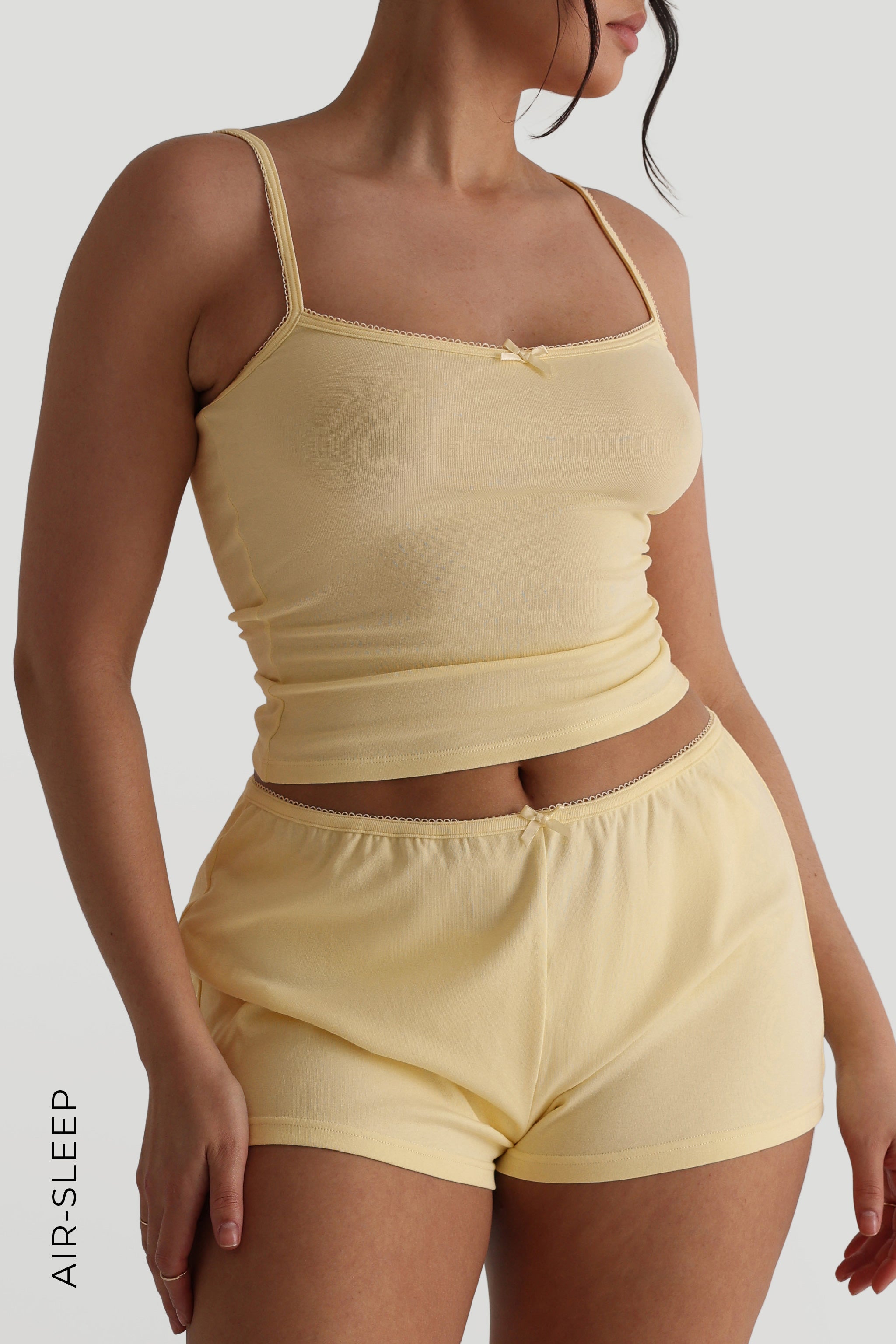 The Air-Sleep Lounge Cami Tank Top offers a minimalist design with a subtle twist. Featuring a simple, flattering cami cut, it’s enhanced with a delicate bow detail for a touch of charm. Made from our lightweight Air-Sleep fabric, it provides a breathable, comfortable fit that’s perfect for relaxing at home. Effortlessly stylish and cozy, this cami tank is your go-to for easy, laid-back moments.