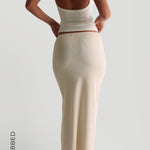 The Form-Ribbed Maxi Skirt pairs soft structure with minimalist design. Crafted to contour gently, this piece flows into a captivating side slit, providing confidence with every step.