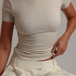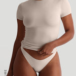 Das Mist Kurzarm-T-Shirt , auch bekannt als unser No-Bra-T-Shirt, ist unser meistverkauftes Stück. Es ist aus unserem charakteristischen Stoff gefertigt und bietet Halt für alle Brustgrößen, ohne dass ein BH erforderlich ist.