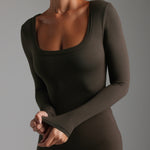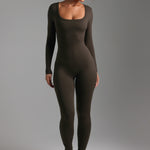 The U-Shape Long Sleeve Jumpsuit features a one-inch banding along the scooped neckline to flatter any chest size.