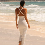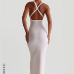 Our Form-Ribbed Plunge Split-Back Maxi Dress is crafted in a soft, sculpting ribbed knit that moves with the body. A plunge neckline with cross-back detailing, create a fluid, elongated silhouette—modern, refined, and ideal for warm-weather moments that call for something effortless.