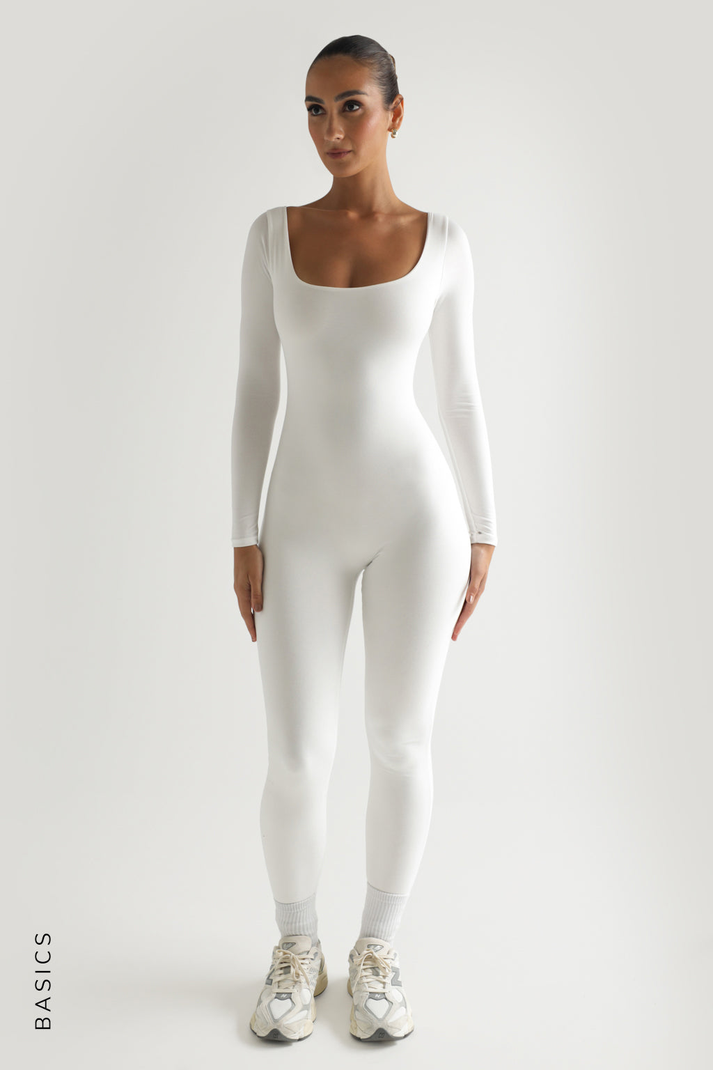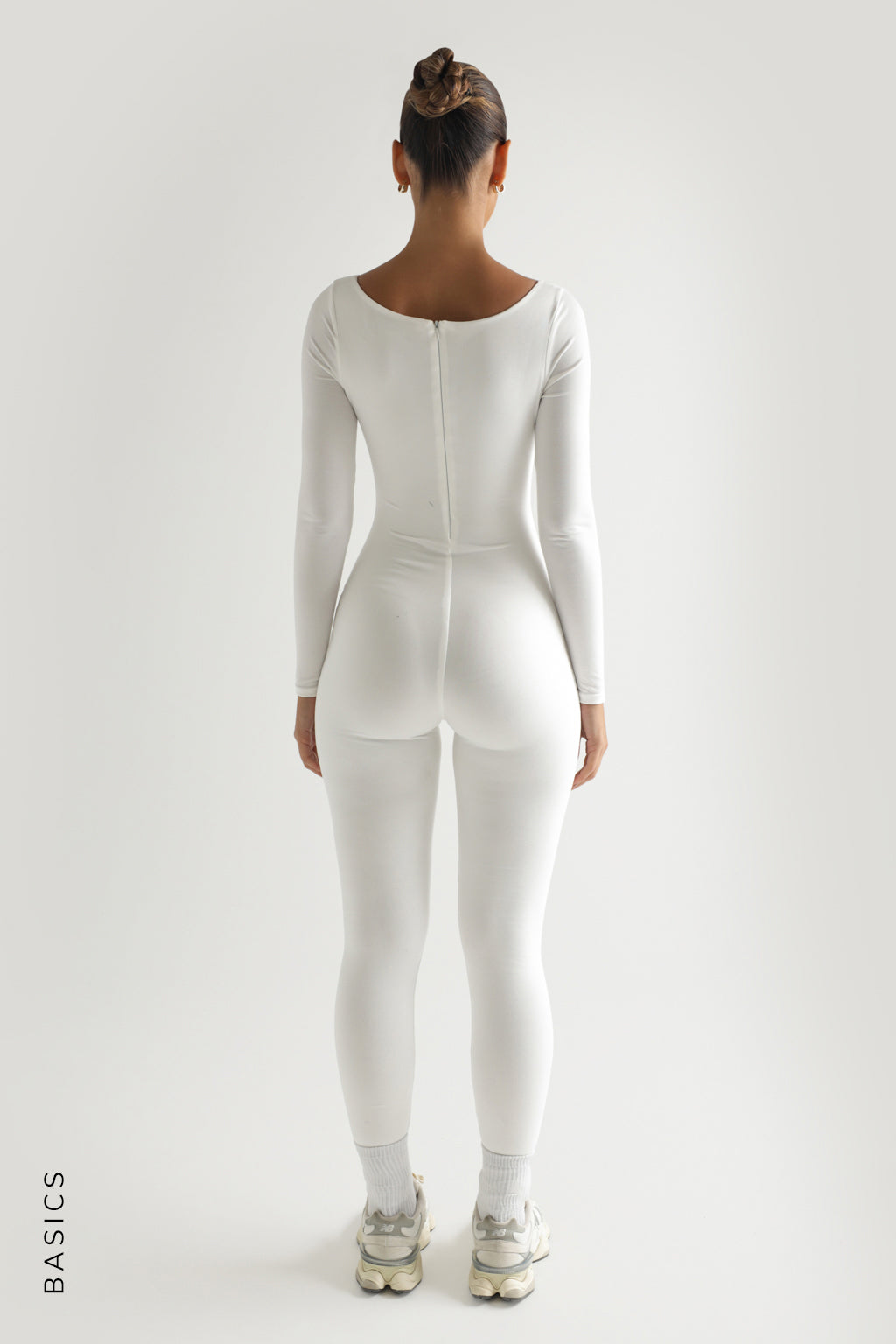 The Round Neck Long Sleeve Jumpsuit is full-length with an invisible zipper back and a round neckline that flatters all chest sizes.