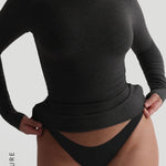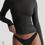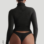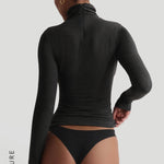 The Refined Long Sleeve Turtleneck T-Shirt features a thoughtfully engineered invisible, back zipper, designed to facilitate effortless dressing while preserving your hairstyle and makeup.