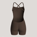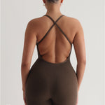 Katy Romper thigh-length romper featuring a backless design and a square neckline. This romper excels in facilitating uninhibited movement, adding to its versatility as a wardrobe staple.