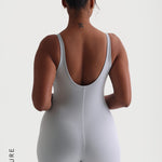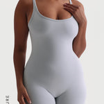 The Banded Scoop Neck Romper was designed with a scooped open back that compliments its scooped neckline. It features a thin trim along the neckline for added detail and contrast.