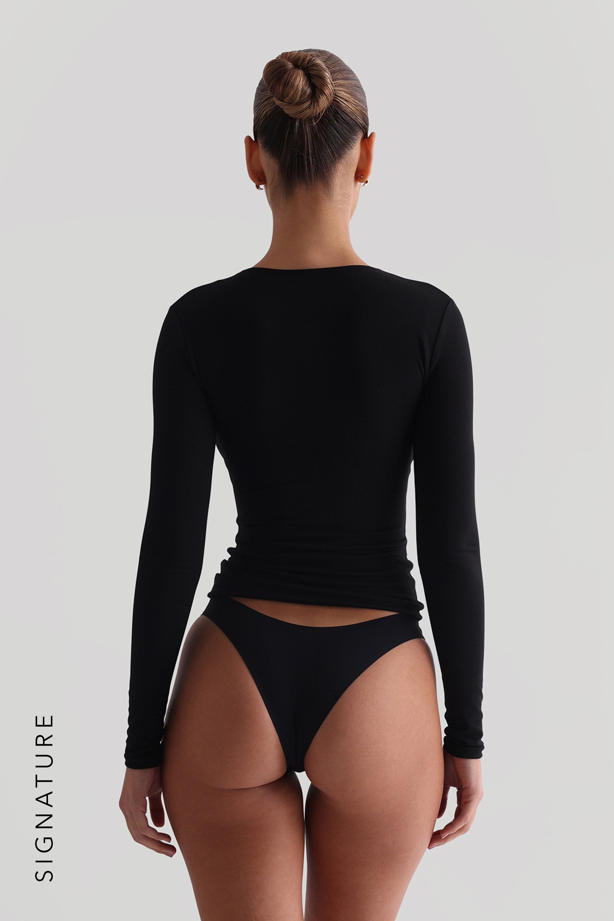 The Zip-Up Long Sleeve T-Shirt, one of our best-sellers, was designed with a built-in zipper that can be adjusted to your neckline preference.