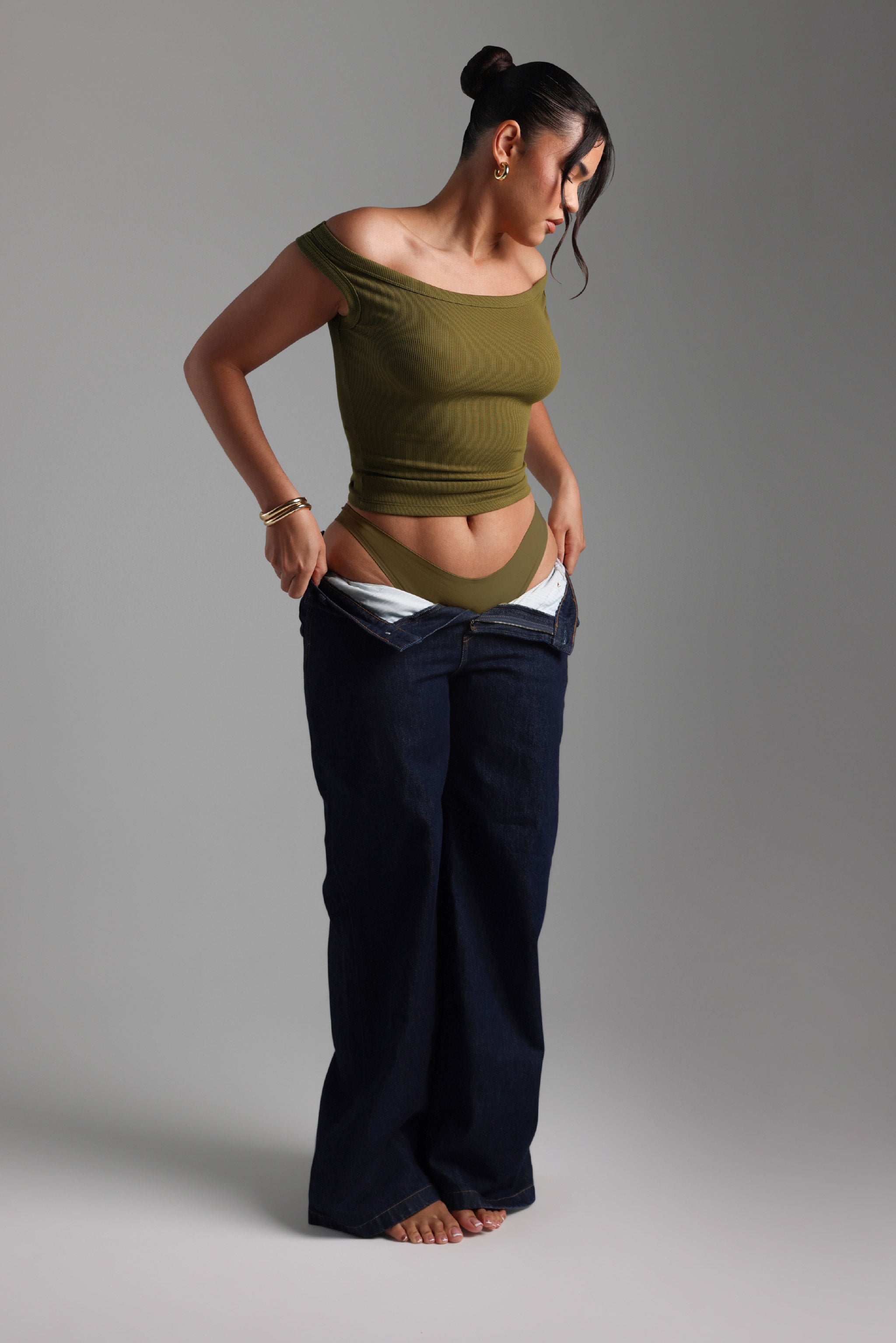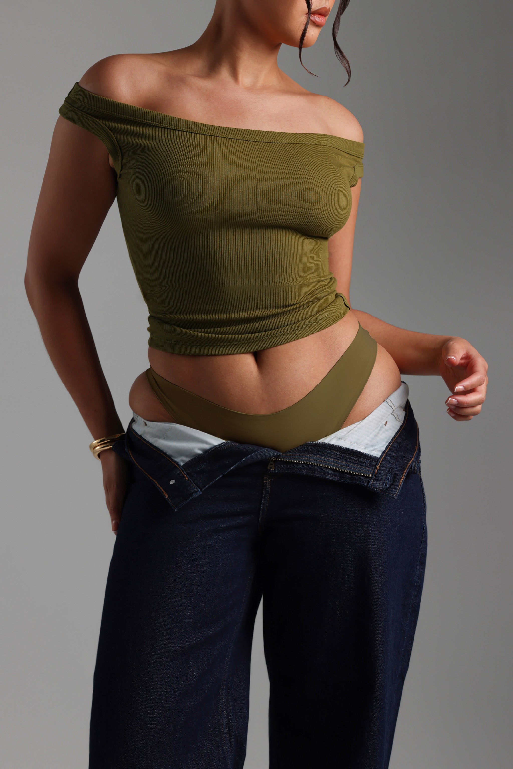 Form-Ribbed Off Shoulder Top - Olive