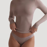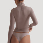 The Refined Long Sleeve Turtleneck T-Shirt features a thoughtfully engineered invisible, back zipper, designed to facilitate effortless dressing while preserving your hairstyle and makeup.