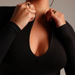 The Zip-Up Long Sleeve T-Shirt, one of our best-sellers, was designed with a built-in zipper that can be adjusted to your neckline preference.