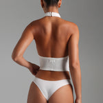 Highlights: double lined, vertical ribbed pattern, halter neckline