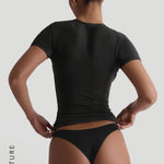 Known as our No-Bra Tee, the Mist Short Sleeve T-Shirt is our best-selling piece. It is made in our Signature fabric and provides support for all chest sizes without the need for a bra.