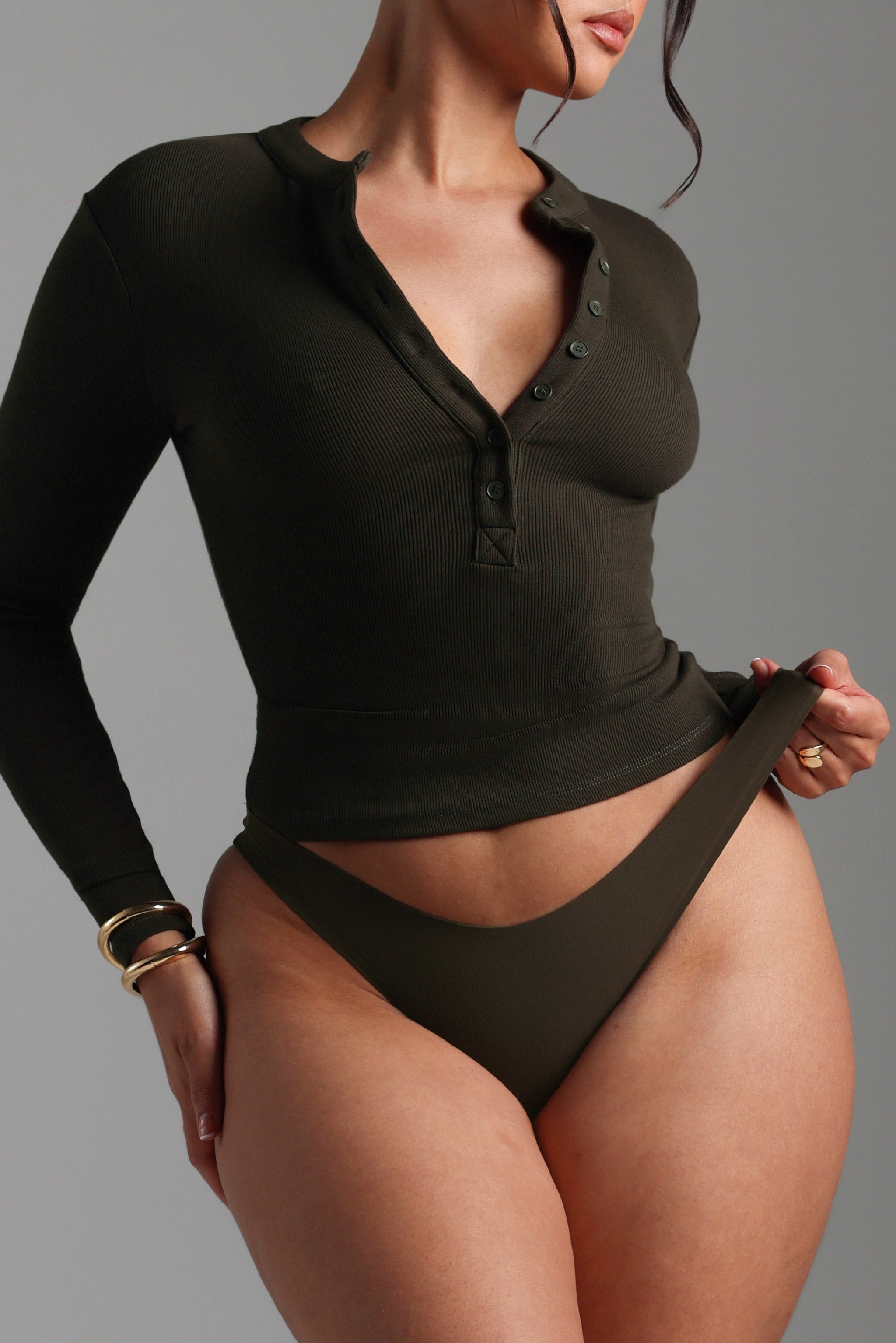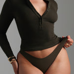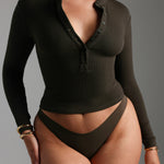 Form-Ribbed Button-Up Long Sleeve T-Shirt - Charcoal