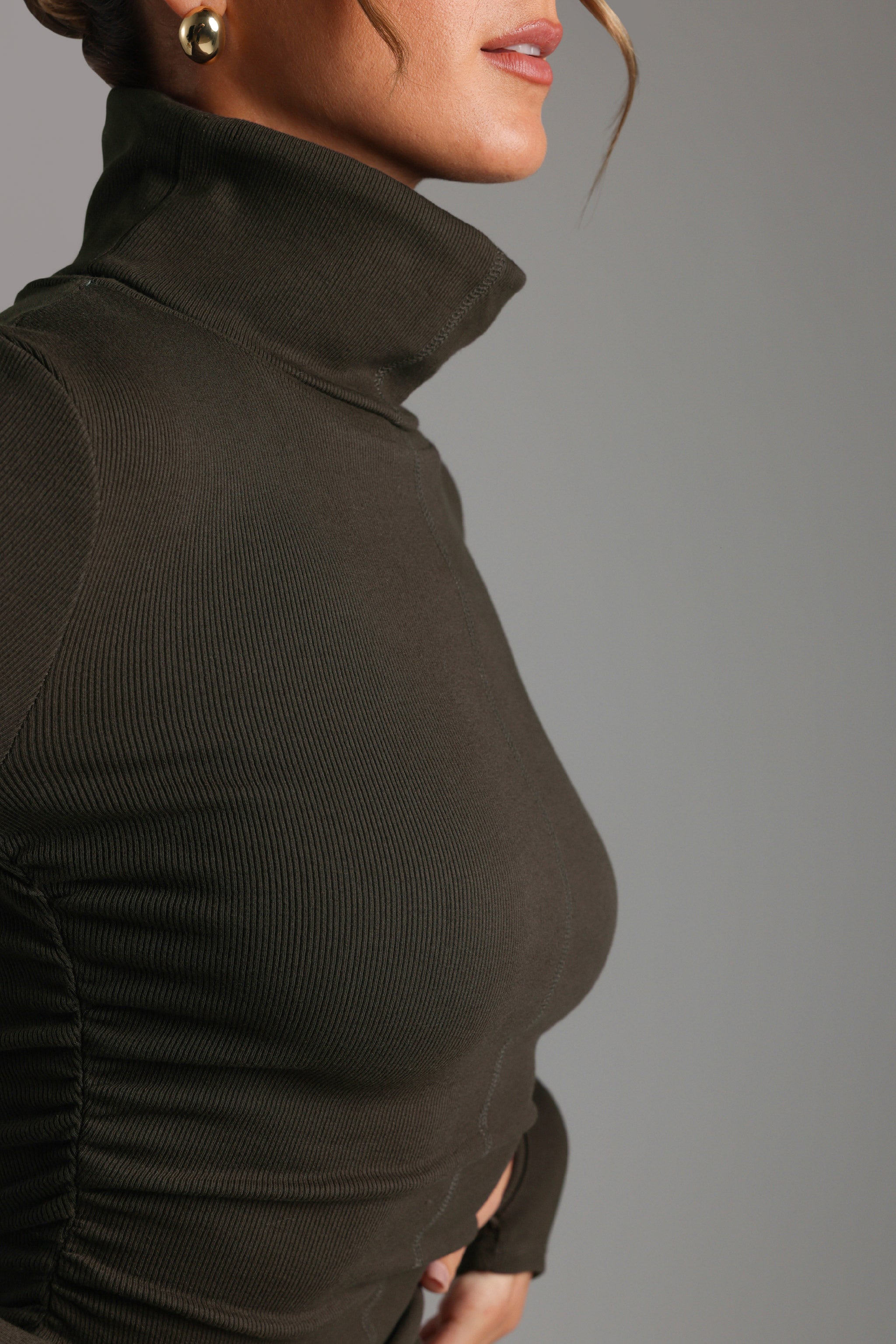 Highlights: high-rise turtleneck, front seam for added contrast, ruched side seams, soft inner lining, textured ribbed design