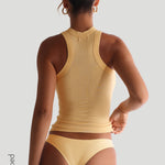 Highlights: single-lined, vertical ribbed pattern, lightweight, high-cut racer neckline